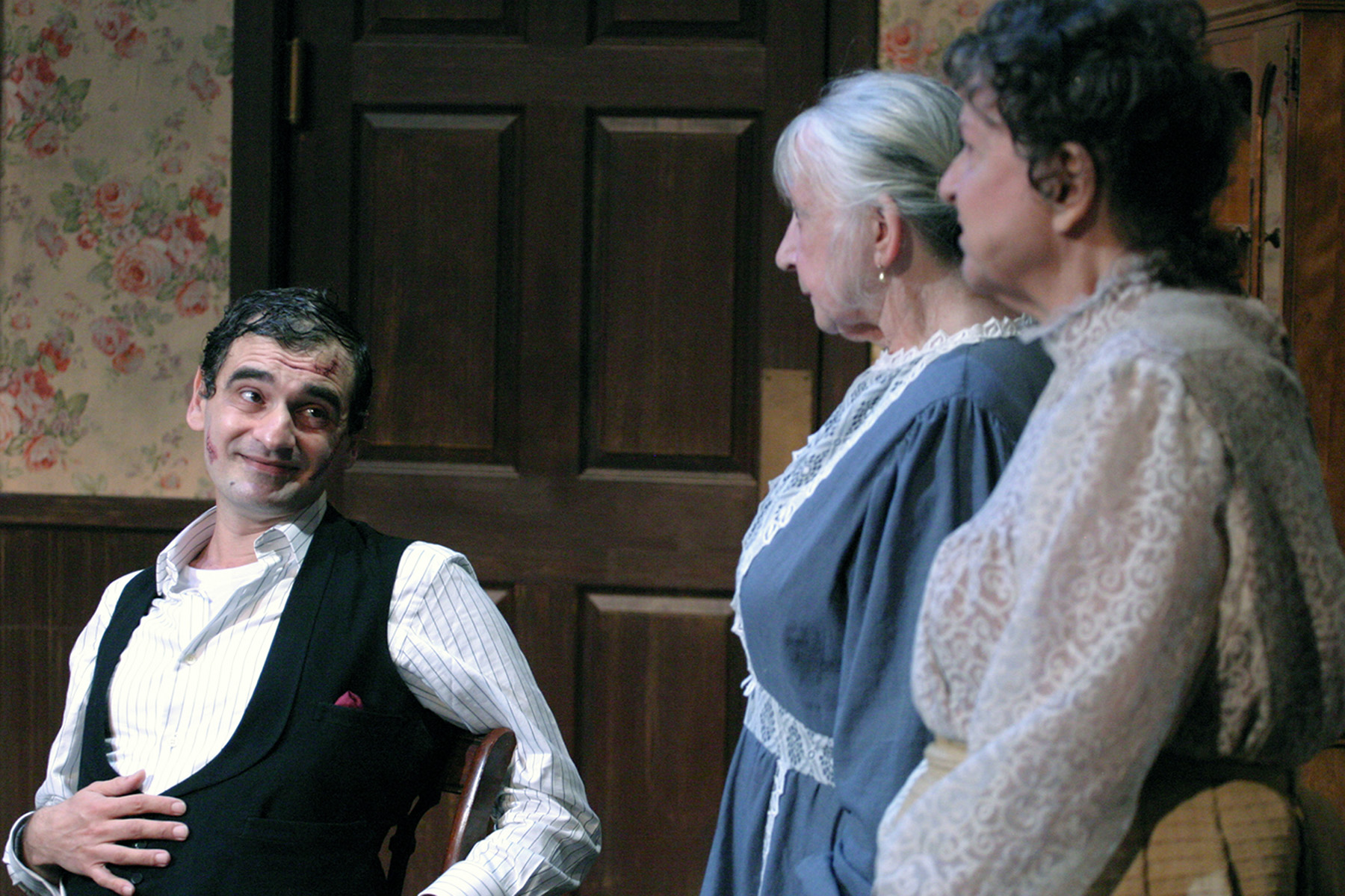 “I’ve seen that face before! Abby—do you remember when we took the little Schultz boy to the movies and I was so frightened? It was THAT face! Have you been in an accident?!” Gera Hermann as long, lost nephew “Jonathan Brewster” proves to be a most unwelcome visitor for Sheelagh Cullen as “Abby Brewster” and Jacque Lynn Colton as “Martha Brewster” in “The Odyssey Theatre Ensemble’s Production of “Arsenic And Old Lace”