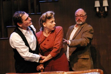 “As he says, the theater can’t last much longer anyway, and in the meantime it’s a living. Yes, I think we’ll give the theater another year or two perhaps…” Sheelagh Cullen as “Abby Brewster” explains to Alan Abelew as the “Reverend Dr. Harper” her nephew Mortimer’s philosophy regarding the state of modern theater while Alex Elliott-Funk as her other nephew “Teddy” listens too, in “The Odyssey Theatre Ensemble’s Production of “Arsenic And Old Lace”
