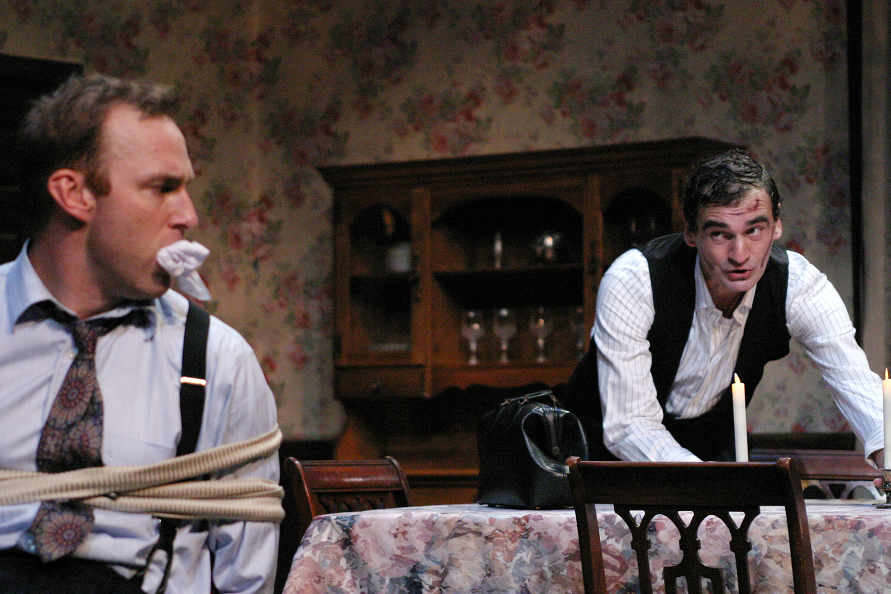 “Mortimer, have you forgotten the things I used to do to you when we were boys? Remember the time you were tied to the bedpost? The needles under your fingernails?” Gera Hermann as “Jonathan Brewster” relives a few ‘happy’ memories with J.B. Waterman as his brother “Mortimer” in “The Odyssey Theatre Ensemble’s Production of “Arsenic And Old Lace”