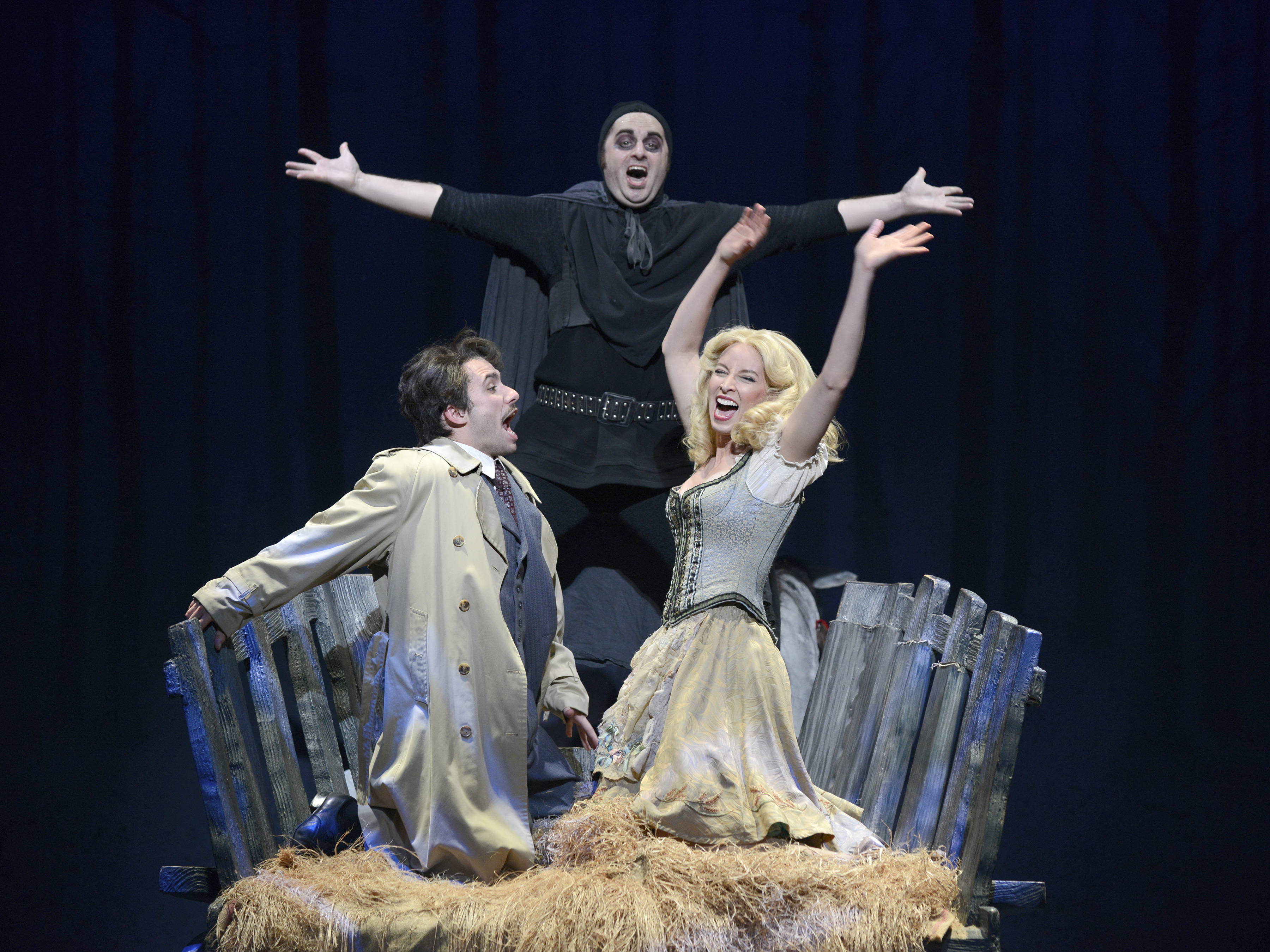 He also does a laudable job with the driven, manic intensity of the climactic “Give My Creature Life”, while also generating his share of guffaws with “Man About Town”, in which he formulates his plan to give the monster something of a public-relations make-over by changing everyone’s opinion of them both. How does he choose to do it? What else? By putting his creation on the Vaudeville stage. Finishing off, he gives us the pensive “Frederick’s Soliloquy’ sung at the gallows, as the doctor prepares to face his untimely end (that is, until nutty luck intervenes—bringing about a startlingly rapid–but happy conclusion for them all: “We can take a hayride when we’re on our Honeymoon,” he croons to Inga; “We’ll make ‘The Son Of Frankenstein’—the sequel’s coming soon!”) As the giddy lab assistant, “Inga”, Julia Aks gets her share of laughs–but refreshingly, doesn’t get them by stooping to be the tired old stereotype of the typical burlesque, busty blond bimbo who has no idea of the effect she has over men (I.E. that of turning them into drooling, stammering, over-heated Junior-High-school boys.) Instead, she get them by being actually funny and having exceptional coming timing (–she sure does have great gams though!) Springing up from a pile of hay in the cart “Igor” has brought to speed “Frederick” to the castle, she promptly informs him “I have a Master’s Degree in Laboratory Science from Heidelberg Junior College; I can fulfill all your needs. I am a very hard vorker, and if necessary I’ll even bend over backvards for you!” Gifted with a pristine soprano voice and a jovial way of disbursing it, Aks shines in her own prefatory number “Roll In The Hay” making it still another bona fide crowd-pleaser (she even yodels during it!) However, as often happens, the more “Inga” and “Frederick” work together the more it becomes obvious that she has a’ thing’ for the good doctor, leading her to admit she wants to “Assist his brains out!” This, she makes acutely apparent in the lush and velvety, “Listen To Your Heart”, which Ms. Aks also elevates into a romantic highpoint of Act Two. Urging the doctor to join her in the simple joys of…er…being ‘simple’, “Inga” playfully cajoles: “Let’s be stupid together; not a thought in our head. Bird-brains of a feather, who fly right into bed!”