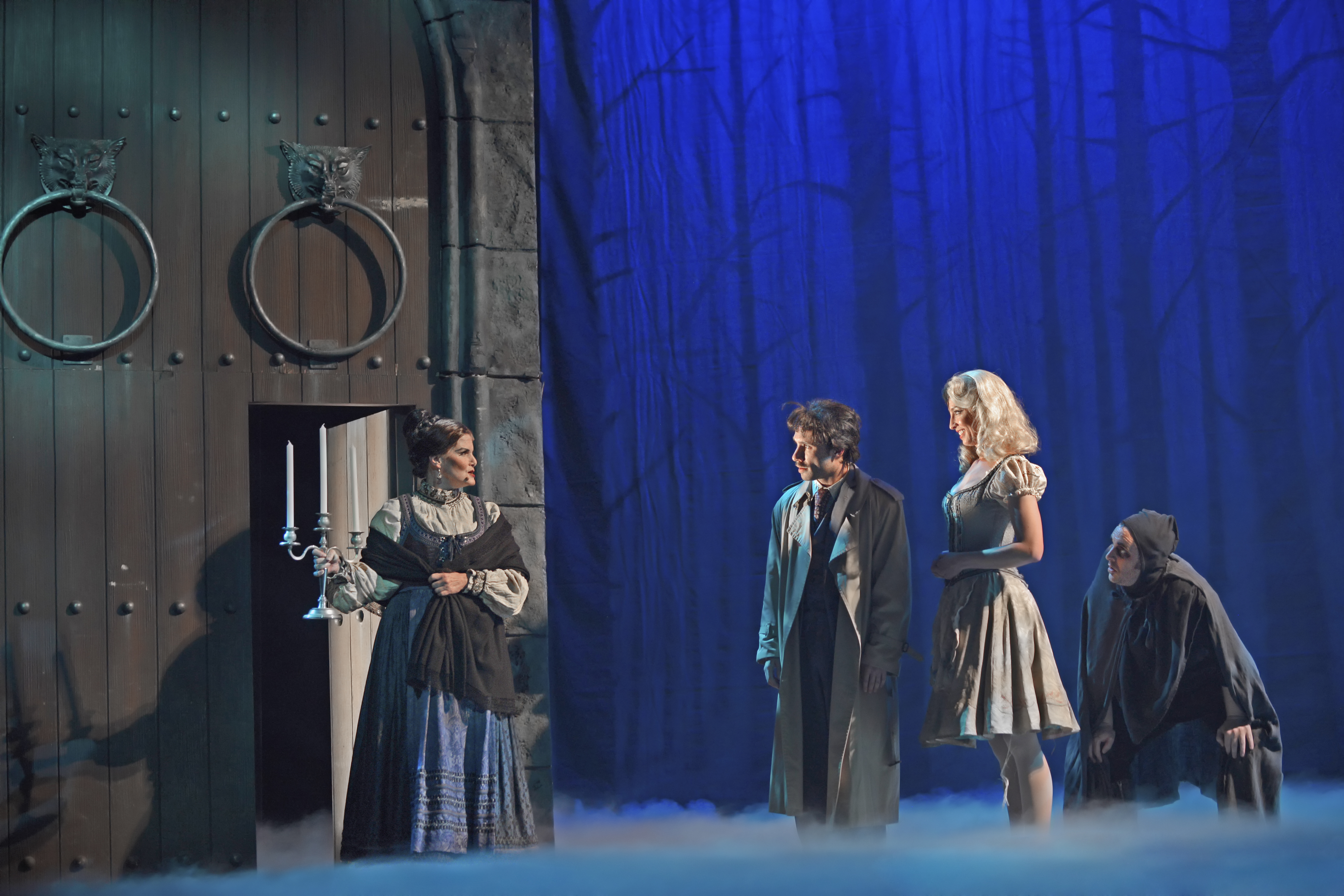 “All is in readiness for your arrival, Herr Doctor. If you vill follow me. Stay close to ze candles…ze staircase can be treacherous!” Tracy Rowe Mutz as Housekeeper “Frau Blucher” greets Dino Nicandros as “Frederick” and Julia Aks as “Inga” (While Erik Scott Romney as “Igor” stands by to calm the horses) In 3-D Theatricals’ Production Of “Young Frankenstein”