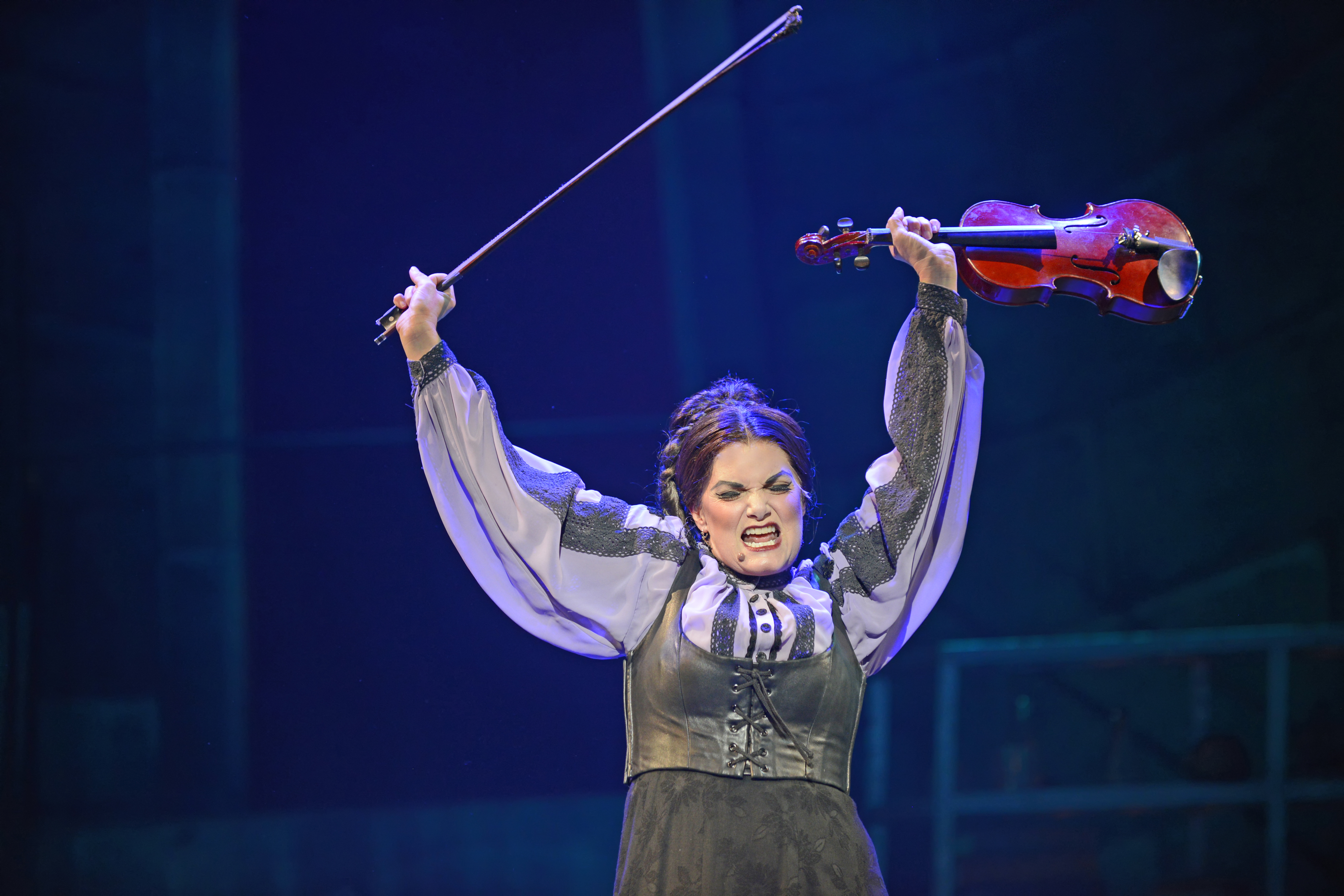 Jean Yves-Tessier’s moody lighting design works in perfect tandem with Jonathan Infante’s projections, which include flashes of lighting (of which there are plenty in this particular show,) and eerie shadow effects from ersatz candles–not to mention the somewhat disquieting lab equipment (–look close and you’re sure to spy a workable Tesla coil too!) Each conjures the look and feel of one of those spine-tingling old Universal black-and-white monster-pictures of the ‘30’s and ‘40’s. They’re also responsible for some brilliant ‘visual puns’ and splashy ‘cinematic’ effects via several shrewdly timed projections. Upon entering the auditorium, attendees are greeted by a looming projection of the castle perched on at the zenith of a tall, craggy hill with an equally, jagged and perilous road straining its way to the pinnacle. At lights down, the title projection (familiar to anyone who’s seen the film) suddenly appears illuminated by the standard lightning flash, followed by the list of “starring” credits with the cast-member’s name and which role we can look forward to seeing them in (–also reminiscent of the film.) Let’s not over the look the amazing sound design by Julie Ferrin either, which, in effect, creates vividly crisp, ‘surround-sound’ throughout the theater! The costumes, by NETworks are a recreation of the Broadway originals by William Ivey Long, and are a work of art in their own right—including copious examples of Multi-colored Tyrolean garb to smooth, ivory lab-coats, and Igor’s vintage yellow rain slicker and matching hat to boot! Furthermore, how many times do you hear even the orchestra get complimented? Yet more than a few of these appreciative comments praising their magnificent work were overheard from the exiting throng on opening weekend.