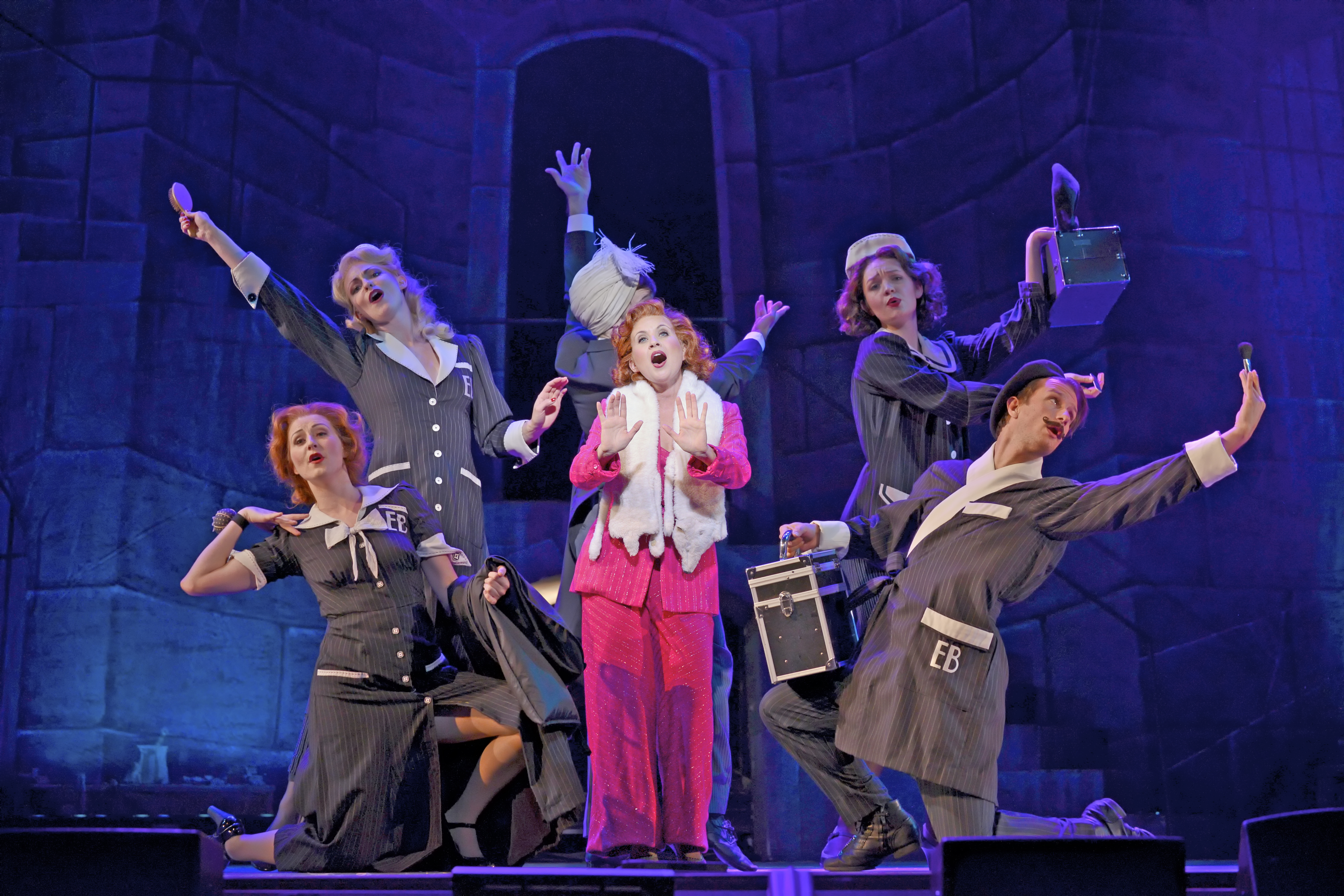 At the castle, Frederick dreams that he’s visited by the ghost of his nefarious patriarch (–the old guy they were planting in scene one,) who instigates another awesome group triumph—“Join The Family Business”, where Brooks’ comedic genius is on full display! Executing some bold “Russian Ballet” like moves with plenty of breathtaking pirouettes and grand-jetes, those assembled (as the Frankenstein Ancestors) construct a humongous effigy of the iconic Frankenstein monster right before our eyes (which then tries to stomp on Fred!) If this weren’t enough, also featured is a singing skeleton named “Mordechai”. “My ancestors are crazy—but boy can they dance!” Frederick breezes upon ‘waking up’. Not long after, delightful “Barbershop” style harmony is also supplied by five gents billed as “The Transylvania Quartet” who perform “Welcome To Transylvania”. Seen just before the act break, it serves as a terrific segue for the nifty “Transylvania Mania”–another rousing group endeavor that closes Act One. A prime example of “fun’ choreography if ever there were any, led by the doctor’s hunchback henchman, “Igor”, its part Polka, part Jive and Jitterbug, and all eye-popping! “Everybody who’s been viewing it, can’t resist its appeal. Everybody’s out there doing it—Millionaire and Schlemiel!” proclaim the townsfolk joyously. (Too bad it has to end with the monster breaking his chains and heading out on a rabid rampage.) After intermission is where all “Mel’ breaks loose, with much of the action conveyed in a series of brief comic vignettes. As for big numbers, far and away the biggest of the big is “Puttin’ On The Ritz”—a holdover from the film which, herein has been expanded and re-envisioned into the musical number to end all musical numbers! Rooted in “Frederick’s” desire to demonstrate a gentler and more ‘human’ side to his brawny creation, it builds into…uh…a monster of a showcase that has the creature performing a debonair routine opposite his own shadow (with the shadow a few beats behind–or working on different steps entirely!) Before he’s through, he’s joined by a whole tap-line—all in elevated “monster” tap shoes. (Go on! Dare your toes NOT to tap along!) It’s so silly it works in spades, and to top it off, we at last get to hear the Monster sing (sort of) and dance. (Busby Berkley—eat your heart out!) Subsequently, even the curtain-call plays like a brisker, bubblier variation on the traditional “Ländler tanzen”, sending the audience out on a resounding high note!
