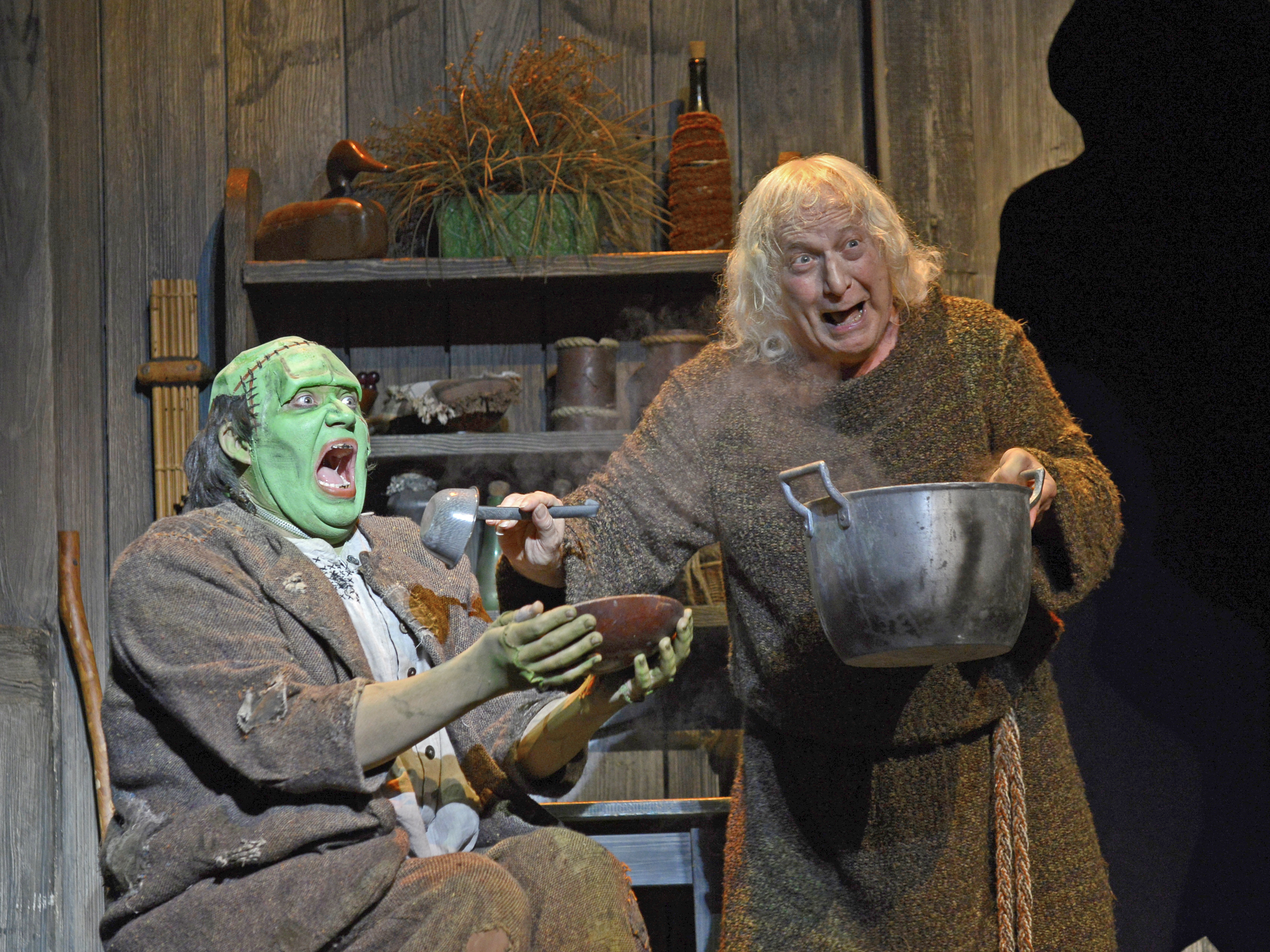 “How about a nice hot bowl of chicken noodle soup? Was that ‘Hold the noodles’? You got it! Nice, hot, boiling soup. Hold out your bowl. Was that a scream of delight? More?” Richard Gould as “Harold, The Hermit” treats Danny Blaylock as “The Creature” to some piping hot soup (all over his lap) in 3-D Theatricals’ Production Of “Young Frankenstein”