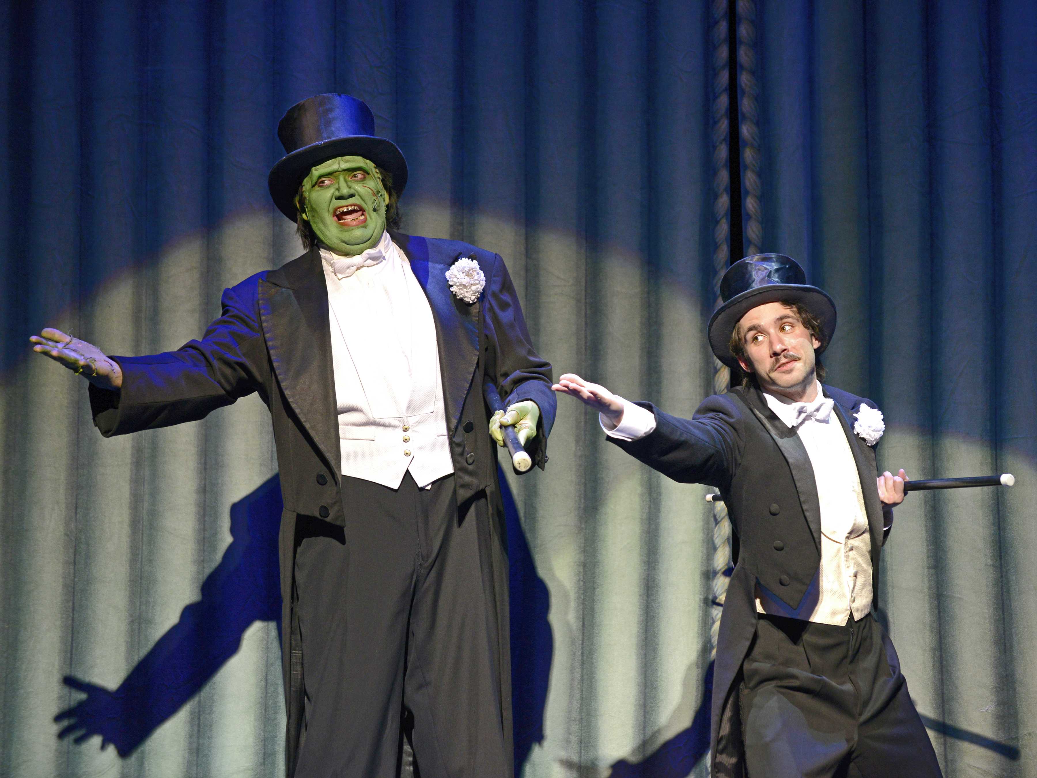 “Have you seen the well-to-do, up and down ‘Park Avenue’ on that famous thoroughfare– With their noses in the air? High hats, and narrow collars, white spats (and lots of dollars) Spending every dime for a wonderful time…” Dino Nicandros as “Dr. Frankenstein” tries to show the world another, more musical, side to Danny Blalock as his “Monster” (Courtesy of a great Irving Berlin standard) in 3-D Theatricals’ Production Of “Young Frankenstein”