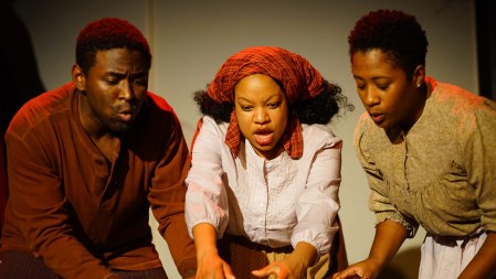 “Tell me, Sister, Tell me Brother how long will it be? Lord give me wings like Noah’s Dove; fly across the fields to the Lord I love!” Ken Maurice Purnell (L) Kymberly Stewart ( C ) and Ambrey Benson ( R ) are rejoicing “Good News” in “The Chromolume Theatre’s” LA premiere production of “Dessa Rose”