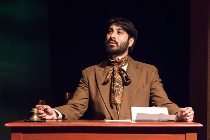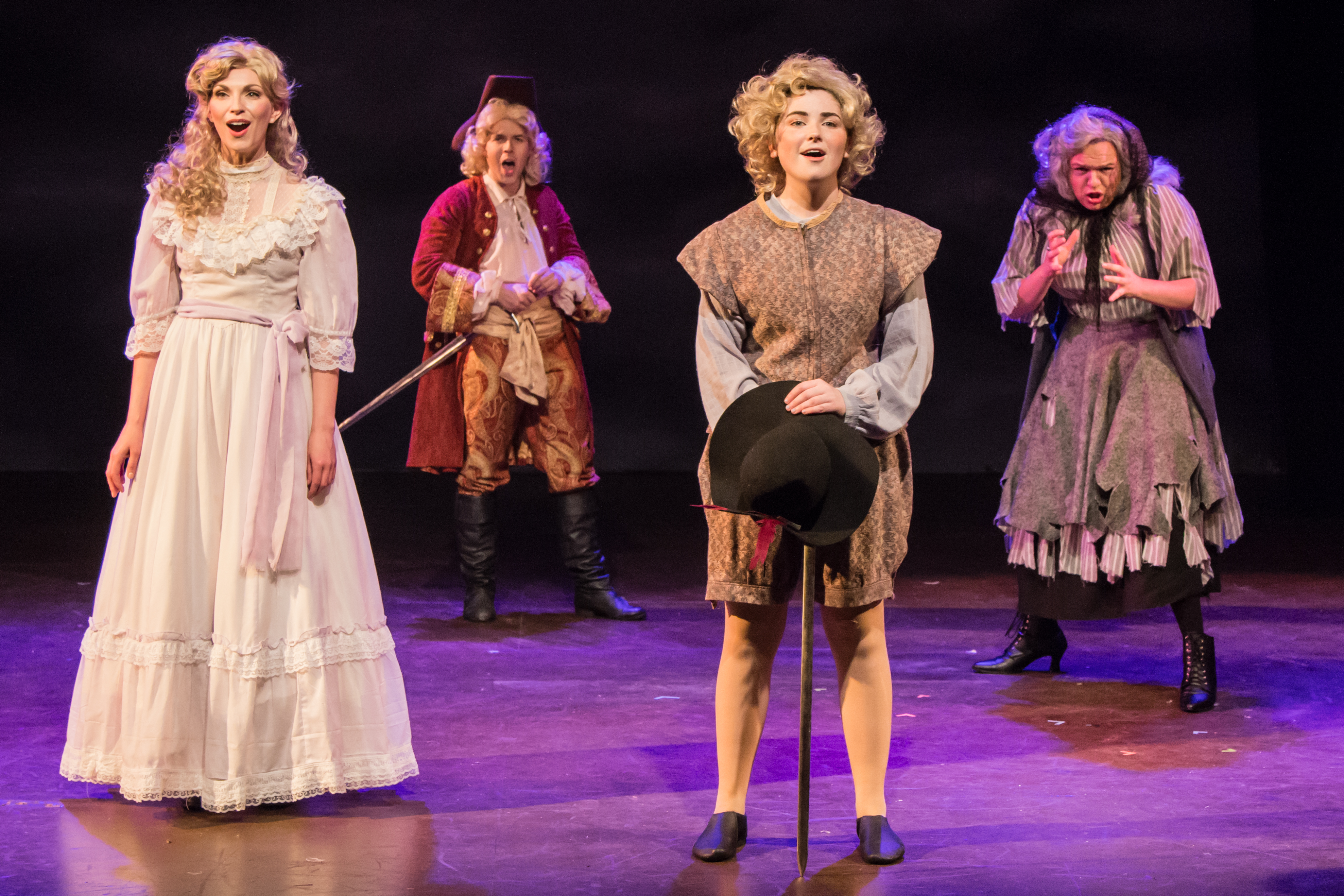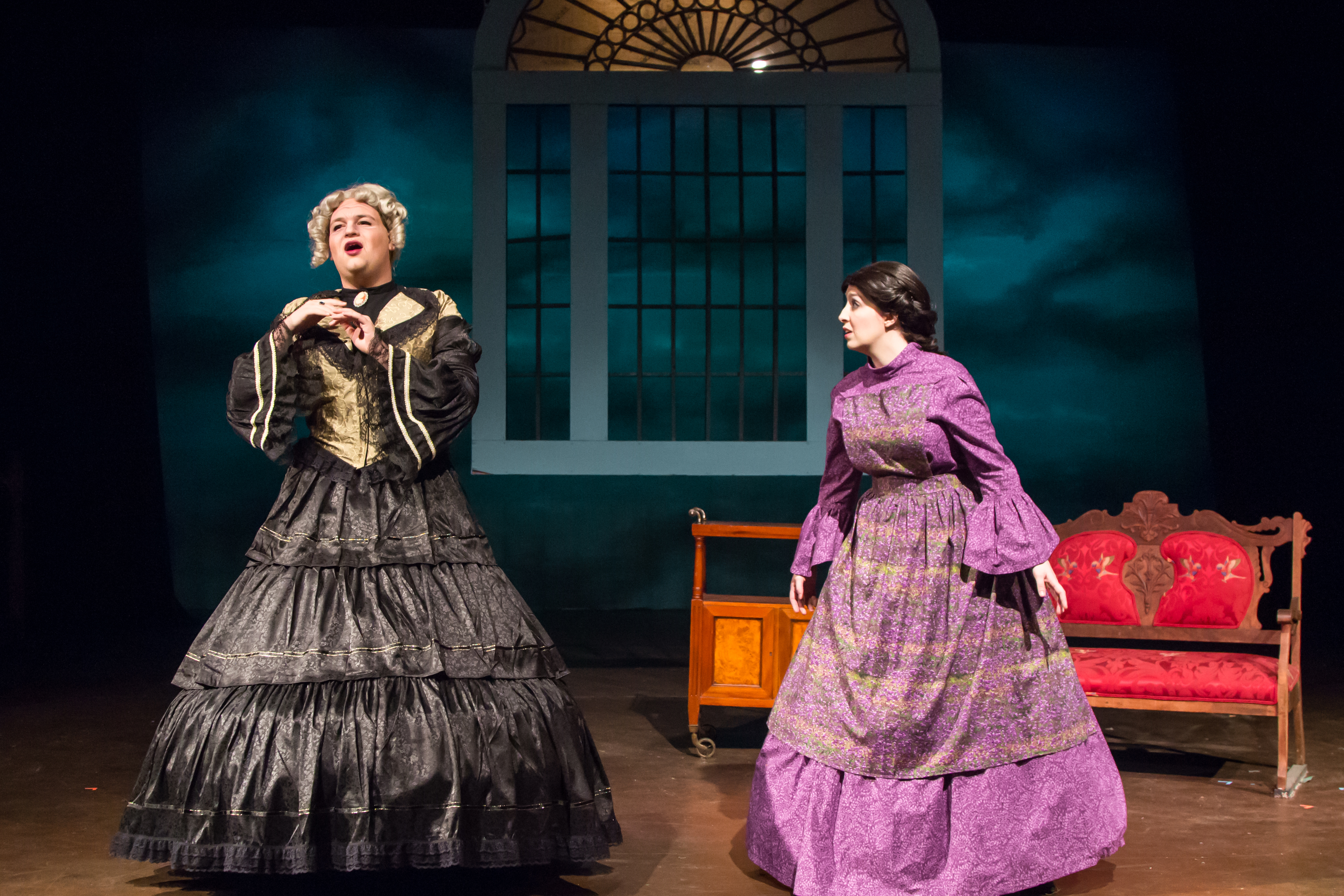 “I am your Destiny–Your Bitterest Foe! You stole what was rightly mine, ten long years ago! You left me cold, alone, and forgotten–Now I’m back to settle the score!” Zoë D’Andrea reveals herself to be the ‘Real’ “Rodrigo” as Amanda Greig as the fair “Clarissa”, Christopher P. Tiernan as (another) “Rodrigo” and Raymond Zachary as the “Old Hag” look on in amazement, as part of “Jo March’s” “Operatic Tragedy” in “The Morgan-Wixson Theatre’s” Production of “Little Women”
