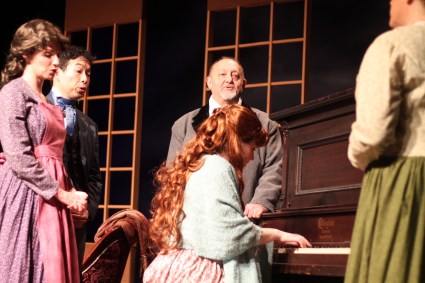 “He’s really not as horrible as we imagined,” Beth tells the others after her abrupt encounter with the man the girls are contented to think of as an ogre. Bringing out his kinder, gentler side, “Beth” and “Mr. Laurence” team together for the jovial “Off To Massachusetts”, which eventually even spurs him to bequeath to her his superior, but sadly under-used piano. Notable as well is Daniel Koh who, in addition to serving as the show’s Musical Director, also offers valorous support as a performer appearing as “John Brooke”, Laurie’s tutor and “a scholar from Boston” the lad informs them (“It’s Maine actually,” he shyly tells Meg upon their meeting.) Koh has a terrific and dramatic vocal styling himself, which he fully invests into the tender “More Than I Am”; then just as creditably, he lends his talents to the reprise of “Off To Massachusetts”. Aric Martin also does a stupendous job in the decidedly tricky role of “Professor Fritz Bhaer”. Save a brief introduction at the show’s very beginning, he doesn’t come into his own until after intermission, but then he develops into a very significant part of our main Heroine’s life. Act Two is also when we discover exactly how rich and magnificent a voice Mr. Martin is also in command of–first with his sung ‘letter’ to Jo, “How I Am” (in which this esteemed and learned ‘Professor’, devolves into a bemused and under-confident school-boy as he attempts to convey his depth of feeling for her, and how much he misses their times together.) The tune also affords Martin a few dazzling ‘money notes by its finish, making it yet another A-Plus—and equally surprising—inclusion to the score! Shortly following, he and Ms. Luoma croon to one another the amorous and engaging, “Umbrella In The Rain” that sees the pair at last declaring their mutual love, and making plans for their life together—even as they humorously contradict one another like any old ‘married couple’.