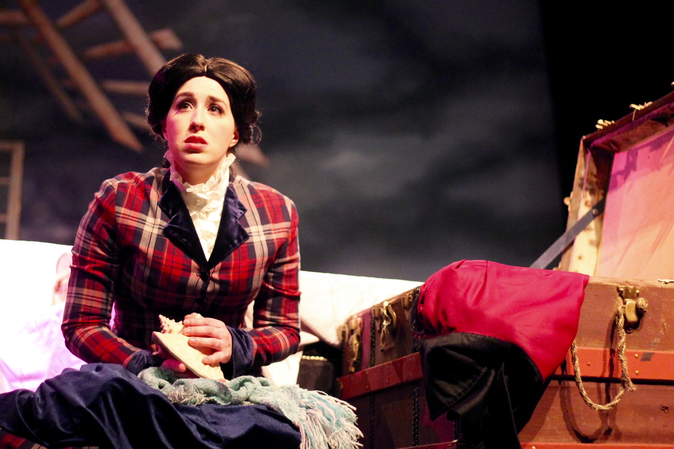 “In this room I knew we were alive–nothing was too painful to survive; we faced the world together, the four of us forever side by side; Everything I promised was for them—I was theirs, no matter where or when!” Alone up in the attic, Alicia Reynolds-Luoma as “Jo” poignantly ponders the passing of time and of loved ones in “The Morgan-Wixson Theatre’s” Production of “Little Women”