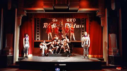 A man of many talents, Newell is also responsible for the Set, Lighting and Sound designs—and each gets an ‘A-Plus’ for originality. Comprised of a collection of vintage ‘steam-punk’ clock-work gears and sprawling metal girders contrasted against elegant red velvet curtains, the effect almost subliminally suggests that the ‘castle’ itself is merely one giant ‘craft’ of the sort that would be conjured in the minds of such turn-of-the-century visionaries as H.G. Wells or Georges Melies. Worthy of note also is the huge black-and-white “R.K.O. Radio Pictures” backdrop —courtesy of Stephen Sands, that sets the scene for the show’s flamboyant ‘floor show’ climax. Like the sets, the costumes are never precisely what you’d expect—but are unfalteringly incredible! Complementing the scenic concept are the similarly fantastic, fanciful—and matching–“Steam Punk” inspired Costume designs by Celestina Hudson. The “Floor Show” alone is a sight to see, consisting of ‘shocking’ red Bustiers, red feather-boas, and fish-net stockings–with lacy crimson panties to boot! (The ensemble sport the same only in midnight black.) Memorable as well are Riff-Raff and Magenta’s silver-on-purple “Space Alien” uniforms (once they’ve seized control,) which favor a distinctive “Amphibian”—Meets–“Queen Of Outer-Space” attitude and quality. But the real ‘piece de resistance’ are the stream-lined ”Pleasure Chest” Bargain Bin/“Ziggy Stardust-Redux” fashions donned by “Frank” up until the scandalous “Floor Show” (–and then watch out!)
