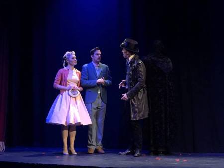 Thanks to the addition of the six-person chorus of “phantoms” who appear and disappear as needed, what is basically a ‘small cast’ musical seems far larger and more impactful. Utilizing pre-recorded orchestrations (many sounding like they were taken directly from the film’s soundtrack,) everyone in the “Maverick’s” cast have pretty potent vocal talents and even more dexterous dancing abilities, which are put to excellent use thanks to Choreographer Kelsie Blackwell’s top-notch dance routines. Often these explode into—and enhance–the proceedings when they’re least expected; but rest assured they never fail to delight once they occur. A fine example of this is “Dammit Janet”—a two person duet that has our lad “Brad” proposing to his long-time ‘steady’, “Janet” right after a wedding of friends they’re attending. Starting small, it soon becomes an all-out production number incorporating some really rousing choreography, as our newly betrothed love birds are backed several other ‘50’s era-looking’ couples that comprise the bridal party—including the lucky groom and his obviously jealous bride, “Betty” who seethes over Janet’s having just ‘stolen her thunder’ on ‘her’ special day. Speaking of thunder (–and lighting and rain) here too, Newell’s innovative staging has these same members of the ensemble subsequently gather—now dressed in sepulchral black robes; starting out, they’re called upon to ‘act’ as ‘parts’ of the car our young protagonists are driving in then, (once in conks out,) to follow them all the way through the theater with spray bottles filled with water to in effect. ‘Be’ the storm they’re singing about as they intrepidly make their way toward that light “Over At The Frankenstein Place”. They all ‘cum out to play” again–demonstrating some awesome group harmonizing amidst “Eddie’s Teddy”, then reassemble to loan a sense of energy and added grandeur to the infamous “Floor Show” sequence–making it genuinely worth the wait! The curtain-call (immediately following a brisk reprise of “Science Fiction Double Feature”) reveals the whole company reconvened, who then partake in a swift–but spirited, encore of “The Time Warp” (even bringing a few members of the audience up to join them!)
