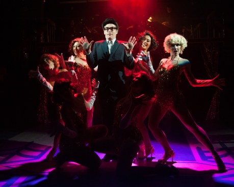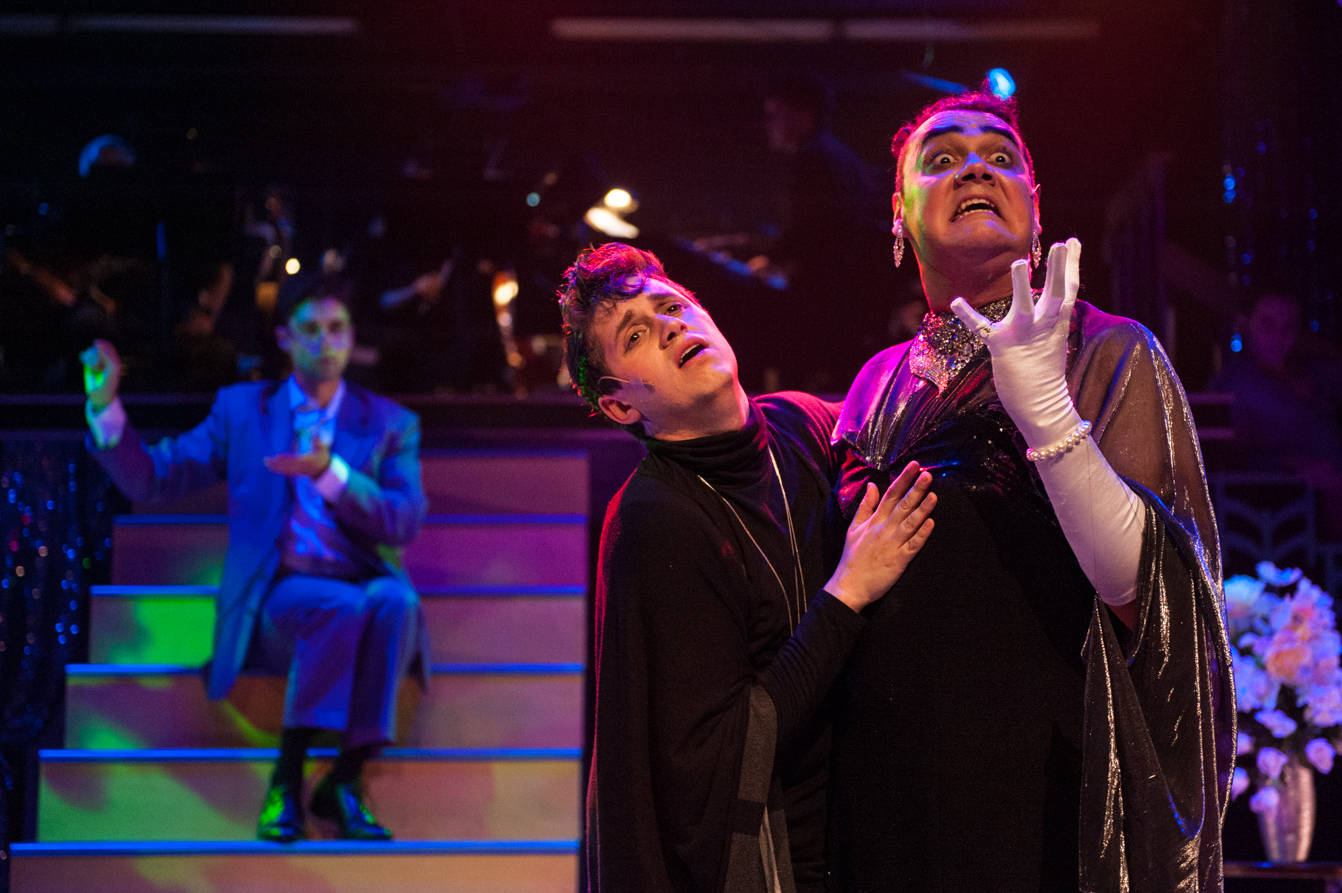 Wally Huntoon’s clever (and resourceful) split-level set is more intricate than has often been hitherto seen on “The Gem’s” stage, with Silver-lame curtains serving as shiny borders, and perhaps for the first time, the orchestra (usually hidden off stage,) is situated up stage above all the action on an elevated platform that essentially ‘frames’ the back of the set. John Hyrkas’ Meanwhile, Lighting Designs rely on digital stage lights that can easily change hue as needed, thus subtly enhancing (to a large degree) the mood of any given scene or song, while also notching-up the general giddiness and geniality inherent to various portions of the story developing before us. An excellent example of this takes place with the intro. to “Whitehall and Marks” (Leo’s ‘day job’) and how it’s bathed in a sickly green light; then, once he enters his ‘fantasy’ in “I Wanna Be A Producer”, the lights change suddenly to violet, and then bright gold to add a mirthful sense of vibrancy, until he finds he’s back in the office at which time they tone-down to a dingy green again. Phenomenal too are the Costume Designs by Ramzi Jneid (–and Oh, WHAT costumes they are!) Indeed, so amazing is the attire sported from beginning to end that they each could easily rate an entire and separate review all their own! Suffice it to say then, that Jneid has given his wildest imagination free reign with the gratifying outcome being everything from saucy gold-lame ‘show girl’ mini-gowns, to saggy, baggy, greyish-blue Haus-Frau frocks (accented with dapper little pill-box hats, naturally) worn by Max’s many ‘investors’, over and above some of the most outlandish German-inspired getups for the fateful ‘show-within-a show’. Even Max and Leo’s opening night tuxedos (–smartly accessorized by with flowing back cape in Max’s case,) are something to lay eyes on. As fantastic as many of them appear though, his designs shrewdly trend more toward the surreal as opposed to anything overtly shocking or salacious.
