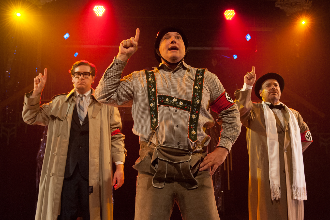 “You may produce my play—but only if you vill take za ‘Siegfried Oath”! A pledge of eternal allegiance to our beloved Fuher!” Chris Harper as “Franz Liebkind” cajoles Alex Bodrero (L) as “Leo Bloom” and Damien Lorton (R ) as “Max Bialystock” to prove their loyalty to the Hitler he knew and loved—the one with a song in his heart, in One More Production’s “The Producers”