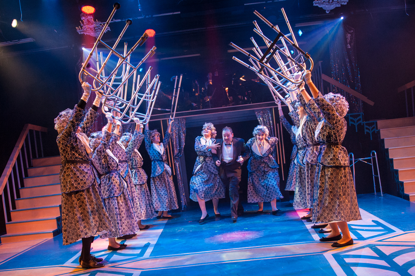 “So romantic, We were frantic, then our prayers were heard up above! Heaven sent us our Bialy! He’s the celebration of love!” Damien Lorton (center) as “Max ‘Bialy’ Bialystock” enters “Little Old Lady Land” to romance a few older ‘investors’ in One More Production’s “The Producers”