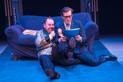 “I see it! I SEE IT! At last the chance to do something important (–of course that whole second act has to be rewritten–They’re losing the war! EXCUSE ME?! It’s too downbeat!” Robert Edward as Director “Roger ‘Elizabeth’ DeBris” and Peter Crisafulli as his ‘Common-Law” Assistant “Carmen Ghia” are having a stroke…of Genius in One More Production’s “The Producers”