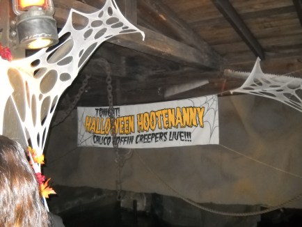 Not to be overlooked either are the rides–many even more pulse-pounding this time of year than any other. “The Timber Mountain Log Ride” has been transformed in the brightest, most festive way possible for a “Halloween Hootenanny” (Featuring the bluegrass anthems of “The Calico Coffin-Creepers” band!) Keep your eyes peeled and you may even glimpse a crashed UFO up there on the Mountain too! At the same time, the “Calico Mine Ride”—itself recently upgraded and improved after 50 years, on this particular occasion has remained curiously untouched (meaning not decorated up for the holiday.) Nonetheless, for many as yet unfamiliar with the new, fantastic look and feel (to say nothing of the incredible state-of-the-art “audio animatronic” figures now populating it,) just seeing all these improvements still made it worth visiting. This said though, here’s a note to those at “Cedar Fair”, the Corporate entity that now owns “Knott’s Berry Farm”: Being that “The Calico Mine Ride” is one of the few ‘inside’ attractions the park contains, makes it by default ‘Blue-Chip real-estate’ at an event like this and too good an opportunity to pass by; so PLEASE next year fire up those imaginations—we’d all love to see this one re-included in all the festivities!
