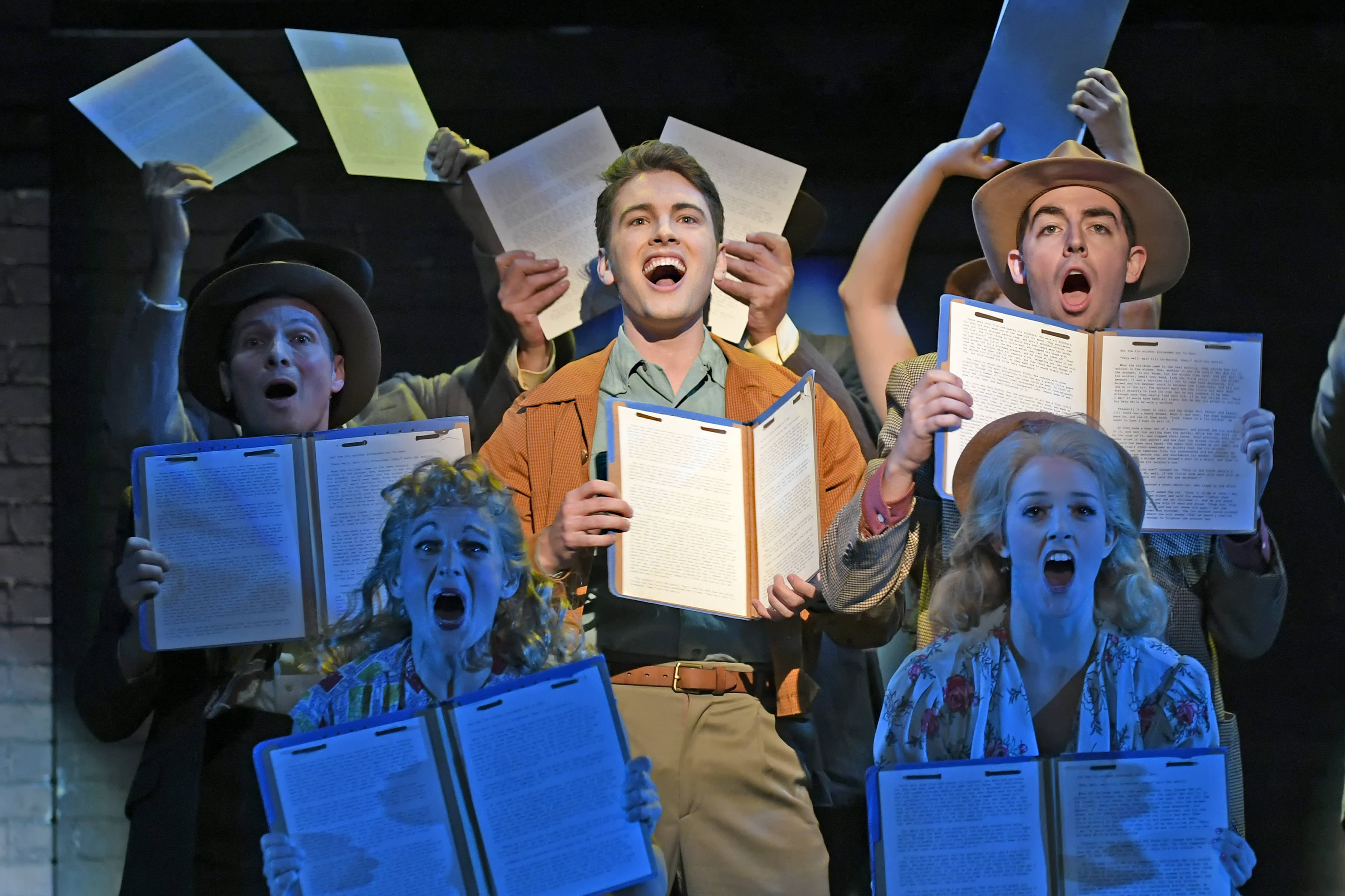 As the ‘Love of her Life’, “Jimmy-Ray Dobbs”, Devin Archer has a tousle-haired, mile-wide-grin kind of boyish charm, not to mention he, himself packs a high-octane vocal wallop (with just a hint of that ‘lonesome country-boy’ wail on those extended money-notes, as is essential for many of his songs throughout.) “Jimmy-Ray’s” introduction, “Whoa Mama”, one of those bouncy tunes with rapid-patter, punctuated merely by a few lengthy ‘held phrases”, divulges that he truly is a consummate match for Ms. Mintzer: “You’re YOOOUUUNG GIIIIIIRL, and ya outa know better …” he playfully belts out as the two engage in their melodic flirtation. As they grow as closer as two hormonally charged kids can get, she tells him, “This is Hicksville–and we’re the hicks in the Ville—unless we get ourselves out!” In his second act “lament” titled “Heartbreaker”, upon hearing of his father’s abhorrent actions, the notes Archer sings, along with each pause in between, reveal the inner devastation of a man betrayed by everyone he trusted. It’s raw, real and unflinchingly honest—definitely a moment one doesn’t often come upon in a musical and Archer administers it superbly. Meanwhile, the gospel-tinged “I Had A Vision” (on the occasion of “Alice” and “Jimmy-Ray’s” unexpected reunion) once again demonstrates each performer’s phenomenal talents at earnestly expressing the meaning and feeling intrinsic to Brickell’s lyrics. “Alice…is it better to hope or is it better to know?” he asks her darkly regarding the perceived ‘truth’ of their child’s supposed ‘adoption’ as both confront their shared past. As “William ‘Billy’ Cane”, Taubert Nadalini is also a significant shot of wholesome, handsome amazement with a voice and talent to match. “He’s a liar, and liars make very good storytellers” Alice says of this lad who drops in seeking a position on her magazine, telling her he has a letter recommendation from acclaimed author Thomas Wolfe whom, he says, wrote to him during the war (never mind that Wolfe had, in reality, died seven years before and wasn’t even around then.) Starting softly as a benediction at his ‘deceased’ mother’s still-fresh place of resting, Nadalini hands over an A-Plus version of the show’s title number as our “Billy”, on his way to seeks his fame and fortune, lets it be known to one and all that he’s a man who “follows his own Bright Star” (this also quickly grows into the full-cast undertaking with some genuinely incredible chorale work from the uniformly talented ensemble too!)