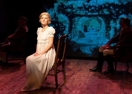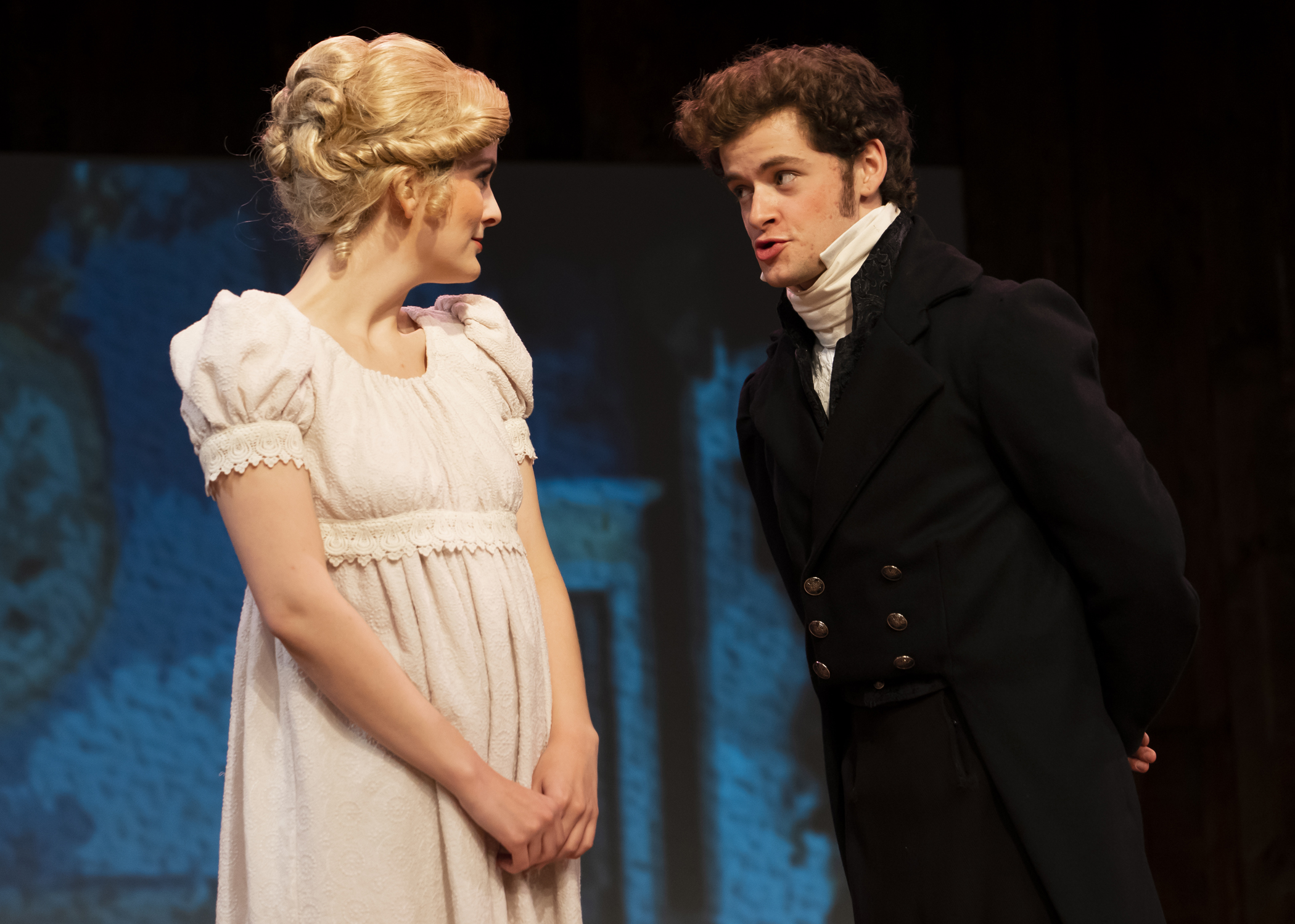 As has become their tradition at “The Chance” involving the “Holiday Literature Series”, the (largely) unadorned wood plank set by Masako Tobaru is augmented by numerous projections by Kristin Campbell (including several which essentially ‘set the scene’ emblazoned across the back scrim, while to either side of the playing area, they feature authentic pages of text from the book in question blown up to appreciable size.) For this story though, the rough-hewn stage, in conjunction with this dearth of more significant/less utilitarian set pieces, surprisingly appears to be the most suitable route. Bruce Goodrich’s Georgian costumes are also absolutely spot-on—accented with wispy white bonnets which most all the ladies wear. In point of fact, the women on stage look like a collection of pristinely attired Regency-period china dolls with gowns whose hues hint at their ‘station’ in life (the brighter the color the more prosperous and ‘elevated’ the lady!) While the men’s apparel, from their sterling top hats, high-collars and waist and tail coats down to the shiny buckles on their shoes (–those that aren’t sporting full-on riding boots that is,) is every bit as striking in their historic accuracy to boot! (The wigs everyone wears are flawless too!) Not to be overlooked either is the crucial contribution made by Musical Director Bill Strongin who also serves as the sole piano accompanist and similarly stays on-stage all through the proceedings (admittedly no small task but without his substantial talent, the ‘musical’ would surely be far less pleasant-sounding!)