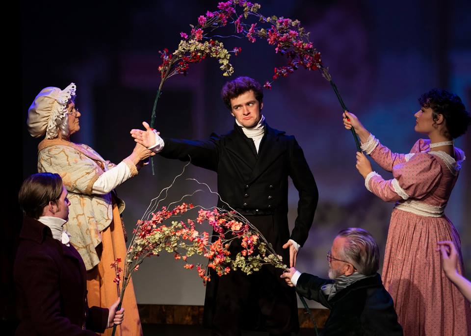 Director Casey Long also maintains this primary focus stressing the humor in the story (and above all as it concerns our girl’s high opinion of herself,) while also taking advantage of the script’s brisk pace (who knew Austen’s saga could be so fast-moving?) Moreover, when not directly involved in a scene or number, he artfully stations the cast at either side of the stage to observe the action, waiting patiently until it’s time for them to step into the spotlight once more. Intriguingly, his tactic seems to efficaciously counterbalance and reconcile the vastness of the story with the general intimacy of the settings (not to mention the more diminutive-size of the auditorium itself.) Not only is the result a remarkably ‘coherent’ retelling of an old favorite, but also one that seems like the perfect ‘fit’ for the “Cripe Stage”! As far as any formal choreography, while there’s very little in the way of “dance” what there is occurs mostly at a post-intermission Ballroom scene (given in honor of “Mr. Frank Churchill’s” return;) even then it is fittingly more in the way of a group promenade as opposed to something more formal or ‘sophisticated’ (Waltzing in England having hitherto not come into vogue at this time.)