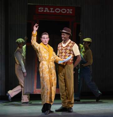 “Moses supposes his toeses are roses, but Moses supposes erroneously; But Moses, he knowses his toeses aren’t roses–as Moses supposes his toeses to be!” Michael Starr as “Don Lockwood” (L) and Brandon Burks (R ) as “Cosmo Brown” try putting a little rhythm into their lesson with Diction Coach Adam Lendorman (Seated) in “The La Mirada Theatre For The Performing Arts” & McCoy-Rigby Entertainment’s production of “Singin’ In The Rain”