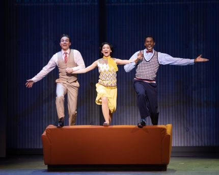“When we left the movie show, the future wasn’t bright; but came the dawn—the show goes on and I don’t wanna say Goodnight!” Michael Starr (L) as “Don Lockwood”, Kimberly Immanuel (C) as “Kathy Selden” and Brandon Burks (R ) as “Cosmo Brown” bid “Good Morning” to a new day in ‘Talking Pictures’ in “The La Mirada Theatre For The Performing Arts” & McCoy-Rigby Entertainment’s production of “Singin’ In The Rain”