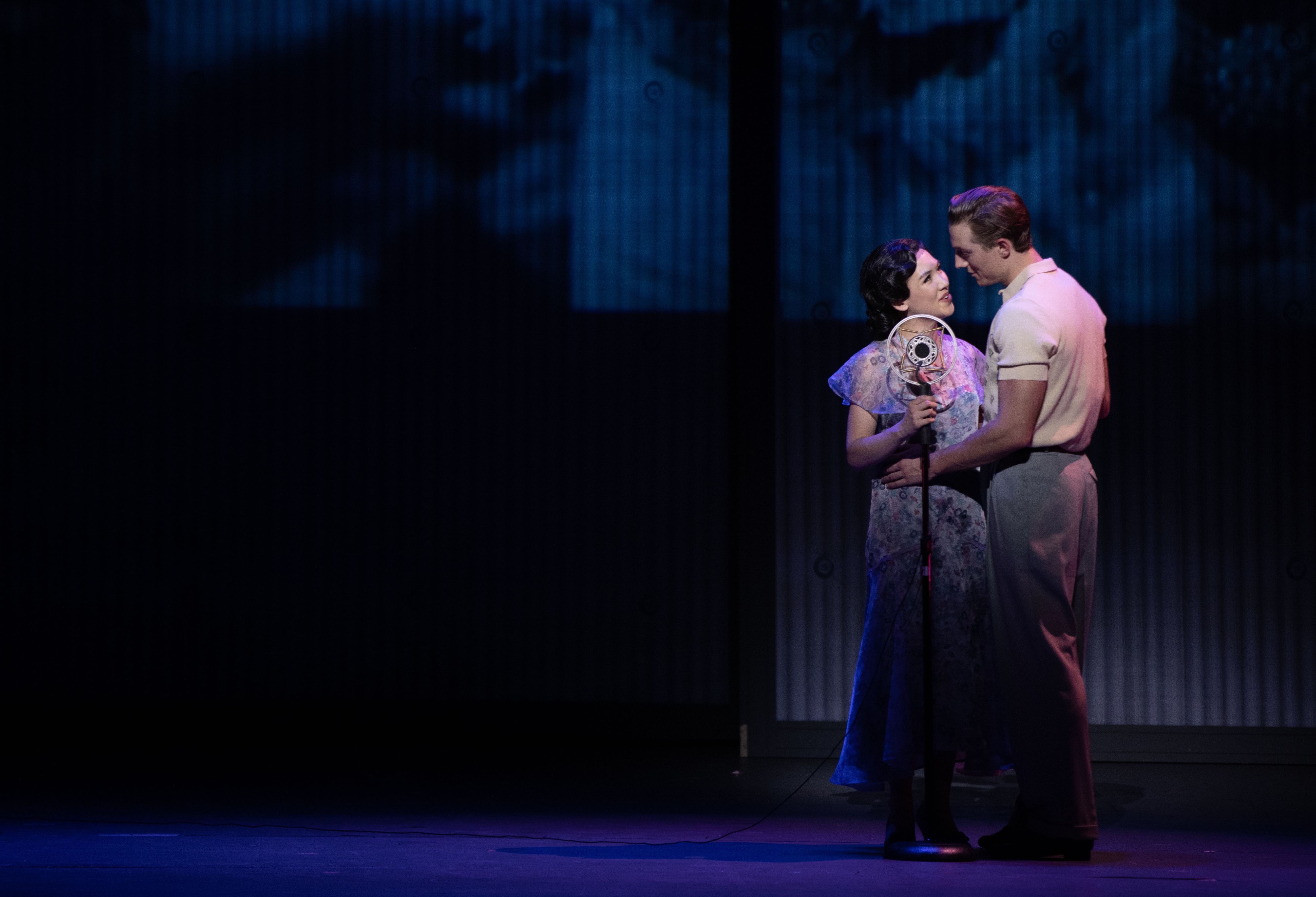 “He’ll kiss her with a sigh, (Would you? Would you?) And if the girl were I, would you? Would you? And would you dare to say ‘let’s do the same as they…I would, would you?” Kimberly Immanuel as “Kathy Selden” and Michael Starr as “Don Lockwood” share a romantic “Hollywood Moment” on a Recording Sound-Stage in in “The La Mirada Theatre For The Performing Arts” & McCoy-Rigby Entertainment’s production of “Singin’ In The Rain”