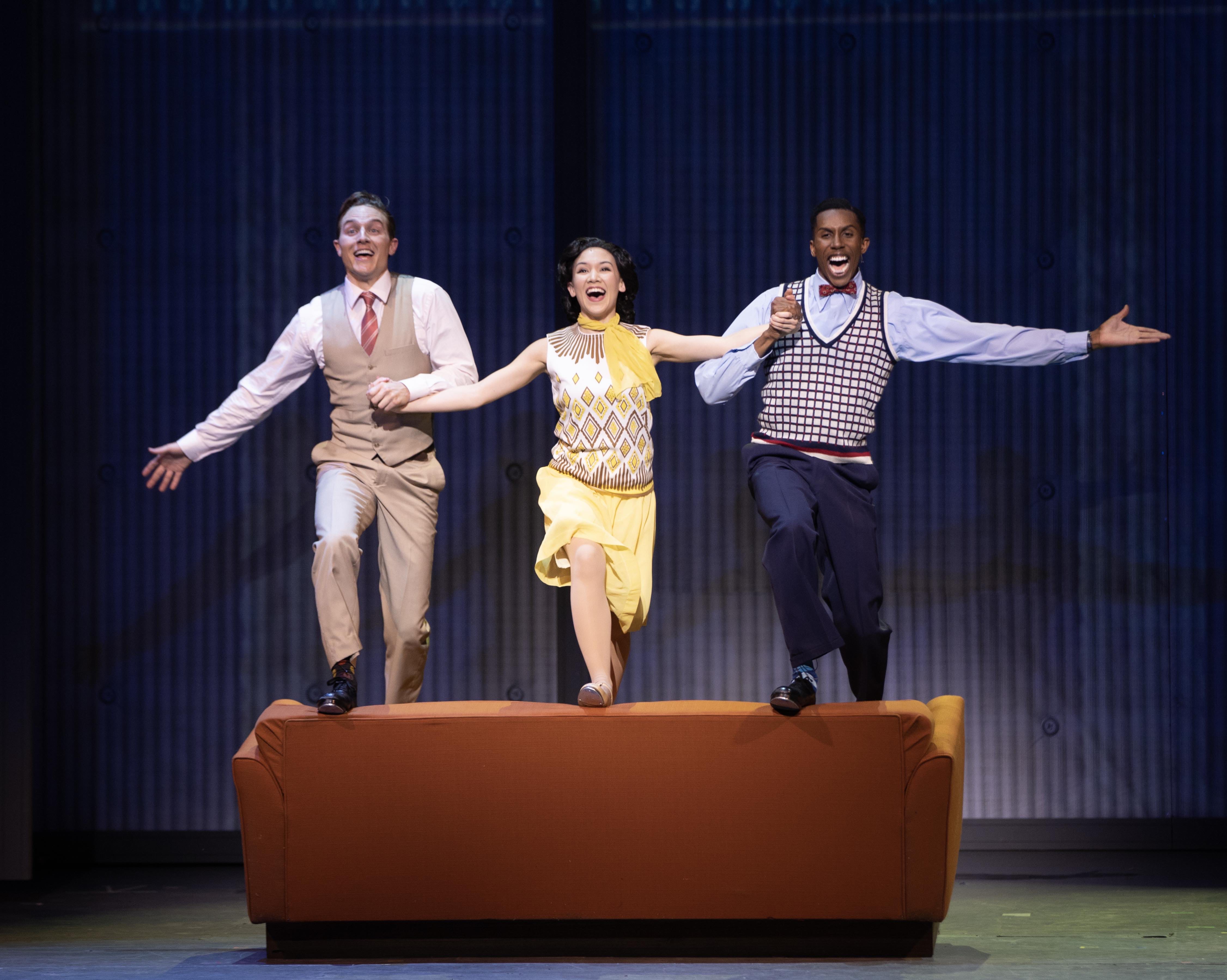 “When we left the movie show, the future wasn’t bright; but came the dawn—the show goes on and I don’t wanna say Goodnight!” Michael Starr (L) as “Don Lockwood”, Kimberly Immanuel (C) as “Kathy Selden” and Brandon Burks (R ) as “Cosmo Brown” bid “Good Morning” to a new day in ‘Talking Pictures’ in “The La Mirada Theatre For The Performing Arts” & McCoy-Rigby Entertainment’s production of “Singin’ In The Rain”