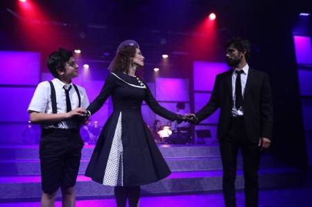 “Guido, you’re NOT crazy—you’re all right. Everyone wants everyone in sight…but knowing you’ll have no one if you try to have them all, is part of tying shoes, part of starting school, part of scraping knees if we should fall’; they’re all part of getting tall…” Eliot DeLucia (R ) as “Little Guido” delivers some sagacious advice about the need to grow up (and act like it) to Ian Michaels (L) as his ‘Older Self” while Nickie Gentry (C ) as “Guido’s Mother” proudly looks on in One More Production’s “NINE”