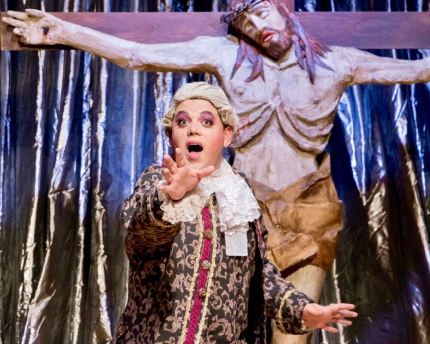 This new production at “The Long Beach Playhouse” is a more intimate interpretation of this solid audience favorite, while still maintaining (and doing justice) to all the elements that made it so unforgettable and groundbreaking to begin with. Performed with a ‘thrust’ type of staging that’s not-quite-in-the round, (it actually has ¾ of the action played out in the center of the auditorium with the audience seated in front of, and on the sides around it,) a formal proscenium stage is situated against the far back wall. Director Gray also incorporates some amiable bits of audience interaction here and there, with many of the entrances and exits occurring all through the auditorium and up the aisles. The musical accompaniment is kept fairly simple, with an 8-piece band sequestered off-stage right, but they get the job done (and then some,) conducting the music much in the same way a smaller establishment, the kind of which is portrayed here, honestly would have. Kudos also go to Ms. Miura’s invigoratingly re-envisioned choreography—most notably for the way she places smaller bits of dance and movement into the most unexpected, but masterful and shrewd places. The jubilant and sporty opening, “We Are What We Are” is staged like a “Miss Universe” beauty pageant with all the ‘girls’ strutting their stuff in a grand promenade, before launching into a breezy Jazz-dance break. Afterward, she infuses a fleeting phrase in which two ‘Cagelles’ dressed like horses ‘tap’ out a few snappy exchanges, consequently affording twice as much delicious variety into this already dynamic spectacle. Then there’s the jaunty little waltz between father and son as part of “With Anne On My Arm”, before the girl in question herself swiftly appears, elevating it into a dapper (but brief) pas-de-deux between Jean-Michel and his new Fiancée that culminates the number. Never shortchanged either are the bigger, “group’ undertaking such as the extended titular extravaganza, “La Cage Aux Folles”, which starts out somewhat simply with “Zaza” acting as our Host-ess, until “Jacqueline”–Proprietress of “Chez Jacqueline” and a friend to our heroes, jumps in, making for a lively duet. When the tempo changes to a sultry tango, the back curtain opens revealing a bird-cage pattern on the hindmost flat, from which the “Cagelles”–done-up like bright and colorful birds who are essentially ‘set free’, ‘prance’ through the auditorium, until a now very ‘Marlene Dietrich’-esque “Zaza” reappears in a white tie, tails and matching top hat. Post intermission, as part of “The Best Of Times Is Now”, the assembled ‘brood’ perform a nifty ‘cake walk’ as the number builds and builds to an uproarious (–literally) climax (–they don’t come any more delightful than this veritable crowd-pleaser!) As befits any Jerry Herman show, the finale is also wonderfully excessive, consisting of a quick recapitulation of all the scores’ best songs in rapid succession—this time as “Georges” (a few ‘political’ jabs in tow,) presents the ‘newer members’ of his ensemble (I.E. the Dindons in disguise, by which they hope to make their ‘escape’ from the press who have gathered outside.) This sees ‘Albin’s” flighty ‘handmaiden’, “Jacob” too, decked out in red as a Spanish ‘Signorita” called “Jacobina”—the temptress of the tropics (“Sugar and spice and everything Vice!” Georges exhorts); “Anne”, (now called “Anne-genue”,) alongside “Jean-Michel”–both in Greek Togas cast as “Venus” and “Adonis”; “Mme. Dindon”, swathed as “Ave Maria” with her dance of the veils (“A siren for every season and a surprise for every sense!” our M.C. continues.) Nonetheless, nothing can prepare you for what M. Dindon comes out looking like!