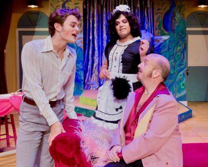 “Who else can make me feel like I’m handsome and tall? Who else can make me feel I’m on top of it all? I found a combination that works like a charm–I’m simply a man who walks on the stars, whenever it’s ‘Anne’ on my arm!” John Vann as “Jean-Michel” sings the praises of his bride to be, while Stephen Alan Carver as his father, “Georges” and Austin James as their ‘Maid’, “Jacob” take heed in “The Long Beach Playhouse’s” 2019 Mainstage Production of “La Cage Aux Folles”