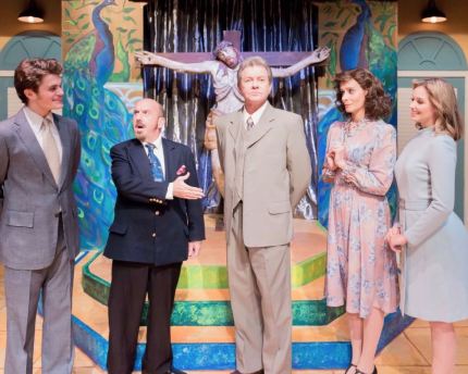 “I joined the Foreign Legion with a sabre in my hand! I crawled across the desert with my belly in the sand–with men who loved their camels and their brandy, and I swear: Nobody ‘dished’! Nobody ‘swished’–when I was a Foreign Legionnaire!” Prompted by John Vann (far left ) as “Jean-Michel”, Stephen Alan Carver (left) as “Georges” sings of days that never were to impress future ‘In-Laws”: Rick Kopps (center) as “Edouard Dindon”, Amanda Webb (right) as his wife “Marie” and Kyra Olschewske (far right) as their daughter “Anne” in “The Long Beach Playhouse’s” 2019 Mainstage Production of “La Cage Aux Folles”