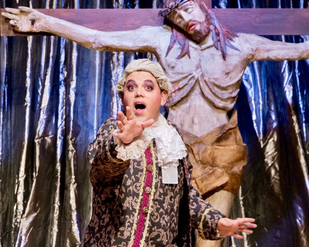 The vivacious scenic design by Greg Fritsche makes remarkable use of the Mainstage’s sizable auditorium, with the physical “stage” set against the back wall. Painted in various vivid hues and framed by a deep blue “Peacock feather” patterned proscenium (–again with the symbolism!) on either side of it is a mural depicting the St. Tropez coastline. At the far (opposite) end of the performance area, are placed two small tables, each with as many chairs, which will be employed at various intervals in the on-stage exploits. Complimenting this is Matthew Mikulka’s often prismatic lighting designs which administer splashes of pastel colors to the musical and dance interludes as needed. However, for this show in particular, it’s the multifarious costumes by Christina Bayer that rightfully (and blatantly) grab the spotlight and hold on to it. Indeed, there’s so many costume changes to be reckoned with, another major part of the fun of this show lies in all the imaginative, ‘fashion-forward’ costumes seen in it! Also to Ms. Bayer’s credit, are the subtle but persistent hints as to the times the show is set in—obviously taking their cues from Poiret’s original play and the comedic blockbuster that sprang from it—both taking place in the 1970’s. From “Jean-Michel’s” polyester trousers or “Jacqueline’s” body-hugging red-fringe shift-dress, to Anne’s pale-azure skirt and sweater combination, or her father’s mildly oversized ties, if you’ve got the vague feeling you’ve seen apparel like these on some old episode of “The Brady Bunch” or “Partridge Family”, you’re probably right. These are merely trifling though, when compared to the gowns and frocks worn by “Albin” and “Jacob”, which could only be considered ‘adequate’ were you ‘Liberace’! (Bayer’s even devised a flaming-red “Hello Dolly” inspired gown with a matching feathered headdress for “Albin” as one of his outfits in the big “La Cage Aux Folles” spectacle–and this is to say nothing of his “Baby Jane” get-up, complete with a rainbow swirled lollypop”!) Amplifying their effect are the synonymously ‘over-the-top’ Make-up designs (also critical for a production like this) by Lolo Pisani. Were there any doubt, just try to picture “Zaza” or any of “Les Cagelles” with any less, or even simply “toned down’–let alone, (–God forbid–) not any, face-powder, colored eyeshadow, or blush. So vital are these, “Albin’s” preliminary ode is even dedicated to them!