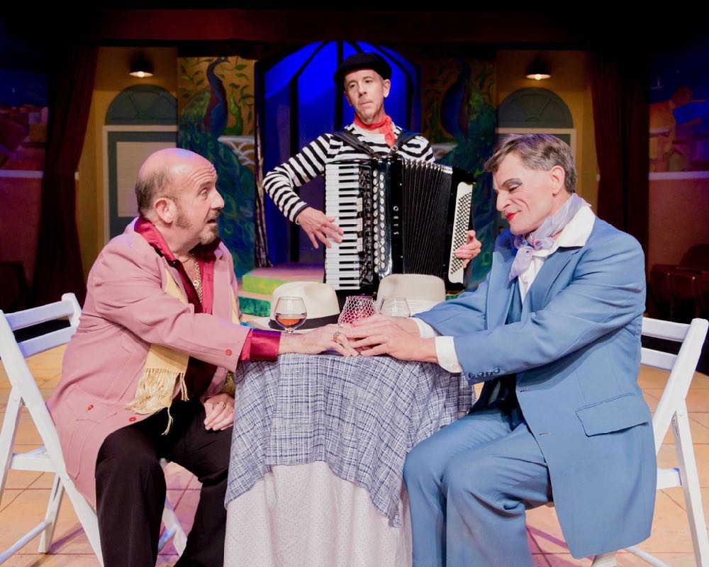 “Through the crash of the waves I could tell that the words were romantic–something about sharing, something about always. Though the years race along, I still think of our song on the sand, and I still try and search for the words I can barely remember…” Stephen Alan Carver as “Georges” spends a quiet romantic moment with Noah Carver as his ‘life-partner’ “Albin”—all set to the accordion strains of Stephen Olear in “The Long Beach Playhouse’s” 2019 Mainstage Production of “La Cage Aux Folles”