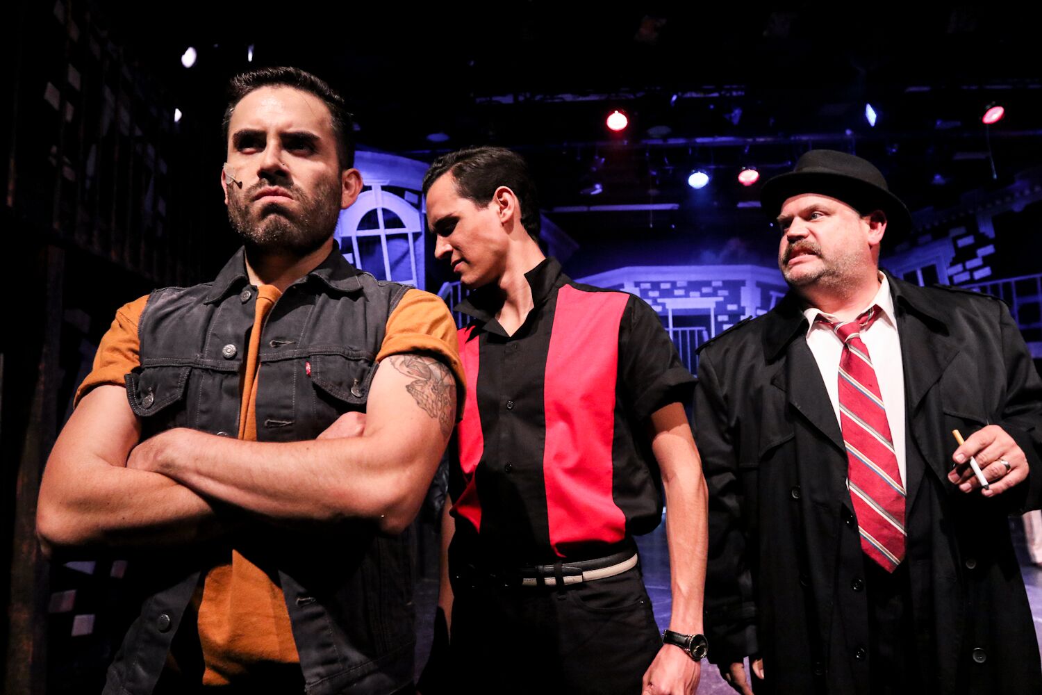 “Sure, it’s a free country and I ain’t got the ‘right’…but it’s a country with laws—and I can FIND the right! I got the badge-you got the skin, it’s tough all over, so Beat It!” Jon Mitchell as “Lt. Schrank” grills Danny Diaz as “Bernardo”, the leader of “The Sharks” and Eric Renna as HIS ‘Lieutenant’, “Chino” in One More Productions’ 2019 Staging of “West Side Story”