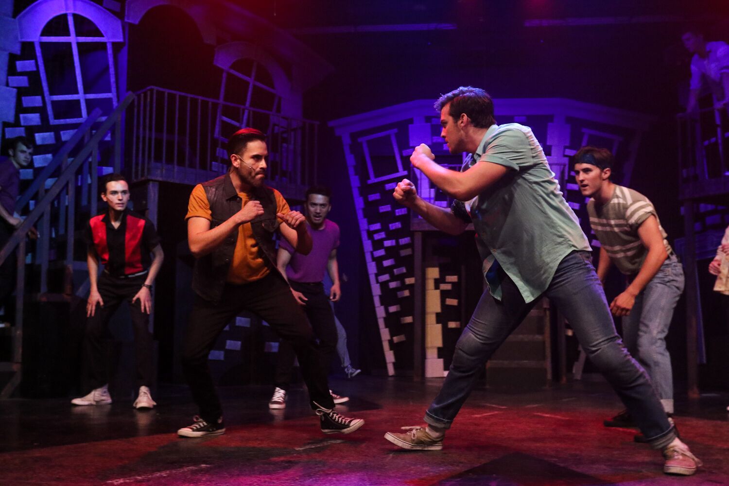 “O.K, Fair Fight! In two minutes, you will be like a fish after skinnin’! I’ll give you a battle, ‘Kiddando’–and I’ll take ‘Pretty Boy’ on as a warm-up!” Danny Diaz as “Bernardo” accepts the challenge to duke it out for control of their turf, which Race Chambers as “Riff” has dared him to take in One More Productions’ 2019 Staging of “West Side Story”