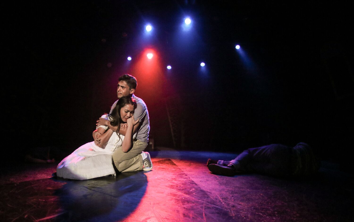 “Some day! Somewhere…We’ll find a new way of living! We’ll find a way of forgiving, Somewhere . . .” Brandon Taylor Jones as “Tony” and Erika Baldwin as “Maria” embrace while the world around them turns dark and mean and ugly as gangs go to war in One More Productions’ 2019 Staging of “West Side Story”