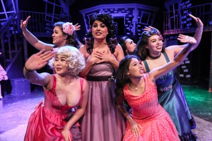 “We’re gonna rock it tonight! We’re gonna jazz it up and have us a ball! They’re gonna get it tonight–the more they turn it on the harder they’ll fall!” Race Chambers as “Riff”, the gang-leader of “The Jets”, with his ‘Best Gals’ Jessie Mays ( R) as “Velma” and Katie Walsh (L) as “Graziella”, finds that leadership can bring certain benefits during “The Dance At The Gym” in One More Productions’ 2019 Staging of “West Side Story”