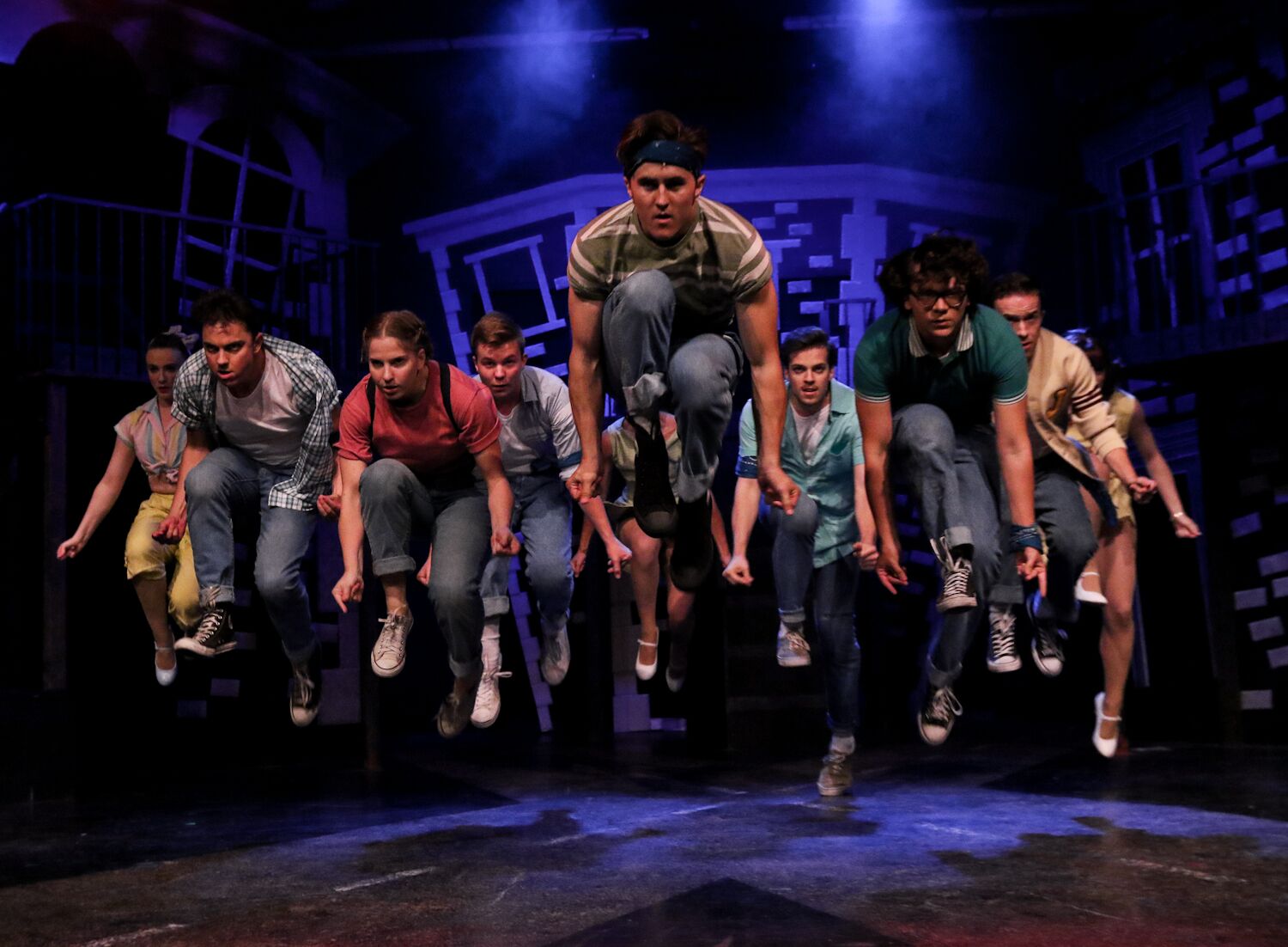 “Here come the ‘Jets’ like a bat out of Hell–Someone gets in our way, Someone don’t feel so well! Here come the ‘Jets’: Little world step aside–Better go underground, better run, better hide!” Race Chambers as Gang-leader “Riff” (center) with Jessie Mays as “Velma” (along with the other “Jets” and their girls,) lies in wait for “The Sharks” in One More Productions’ 2019 Staging of “West Side Story”