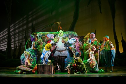 Interestingly, for a show of this size there aren’t all that many ‘big’ production numbers–but when they do occur, they are categorically of the “Splashy” and “Spectacular” kind. After the more ‘story-driven’ Prologue, the first ‘clear-cut’ group undertaking is “The Story Of My Life”, once all the fairy-tale characters have been unceremoniously ‘dumped’ (literally) at “Shrek’s’ front-door in the thick of his marshy home. Their crime? Being too “different”, “strange”, “unique”, “eccentric”, “not enough like everybody else”—choose your own adjective, but it has them all lamenting: “I always dreamed I’d get a happy ending, and this right here, is NOT how it goes! I always dreamed I’d get an ‘ever after’; if this is it–it blows!” Subsequently, when “Shrek” has gone off to complain about this sudden intrusion by story-book inhabitants, he’s met with the brashest and glitziest extravaganza this side of the “MGM Grand” called “What’s Up Duloc”. This serves as a primo introduction to our celebrated “Villain Of The Hour”, “Lord Farquaad”—which even winds up in a flashy “Kickline” with the tiny Tyrant at its epicenter. While Act Two primarily advances through a series of smaller, more intimate refrains or character solos, “Let Your Freak Flag Fly” revisits the characters of the beginning—now disgruntled enough to take action against their indignant ‘plight’. As they cavort, shrewd eyes may even perceive the vivaciously hued back scrim becoming bathed in a plethora of rainbow colors which softly intermingle side by side into one another. The effect, while subtle is nonetheless charmingly happy and gay! (It’s an outright showstopper that’s as festive as they come!) Shortly after, when they storm “Farquaad’s” palace on the day of his nuptials, (with ‘protest signs’ that proclaim “Make Wishes Not War” or that “Elves Are People Too!”,) they break into the bubbly and boisterous “This Is Our Story”, demonstrating each is finally is able to exult: “We are puppets, we are rabbits, we are hobbits (with bad habits) ; we’re a screwy (but delighted) crazy stew! We are different—but united; you are us and we are you—This is OUR story!” The finale, set to the electrifying strains of the “Monkees” teeny-bopper chart-topper, “I’m A Believer”, is definitely the “Happiest “Ever After” ever (–or until August 25th , at any rate!) Insert some suitably spirited choreography into the mix and you have a rollicking curtain call that’s the kind, tailor-made for an exuberant–and vigorous Standing Ovation!