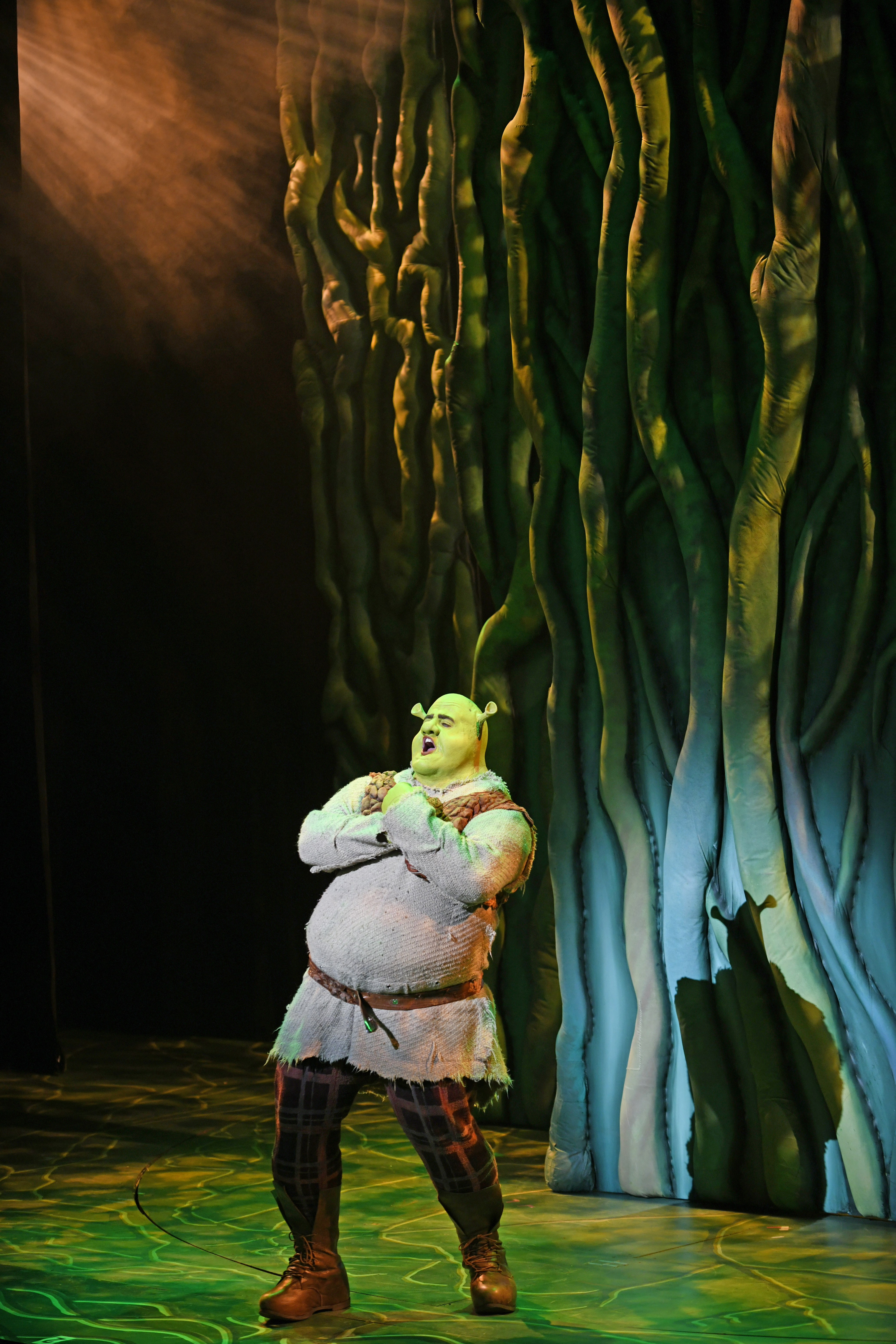 “Keep your big, bright, beautiful world! I’m happy where I am–all alone. I got all I need, so read the stinkin’ sign! Keep your big bright beautiful world. I party on my own anyway, doin’ what I can with a one-man conga line…” T.J. Dawson as “Shrek” claims to love his solitary life the way it is…until adventure comes clawing at his door in 3-D Theatricals’ 2019 Production of “Shrek, The Musical”