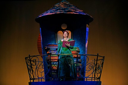 “Now I know he’ll appear—‘cause there are rules and there are strictures; I believe the storybooks I read by candlelight…my white Knight–my Knight AND his Steed–will look just like these pictures! It won’t be long now, I guarantee!” Jeanette Dawson as “Princess Fiona” tries to keep hope of rescue alive atop her tower in 3-D Theatricals’ 2019 Production of “Shrek, The Musical”