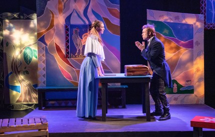 The fetchingly colorful Scenic Design, by Jan Munroe, is based upon the time-honored visual convention of Ukrainian “Pysanky Painted” Eggs—raw eggs which are decorated with traditional folk designs after being dipped in wax (The term pysanka comes from the verb pysaty, meaning “to Inscribe”, because each vividly colored design isn’t painted on, but written, or inscribed usually with beeswax.) This has several set pieces situated around and at the rear of the playing space, while the four-piece band is placed stage left inside an old-school type, “Band Box”. These are well complimented by the multi-colored Lighting Design by Matt Richter and Mary Keegan, which vibrantly accentuates the multichromatic motif consisting of hot pinks, golds, turquoise and hints of forest green and brown. This kaleidoscopic aestheticism also extends to Mylette Nora’s equally vivacious Costume Designs—all of which are spot-on when it comes to her classic “Turn-Of-The-Century” apparel selections; but rather than giving us just another drab, Slavic peasant-influenced recap of the last road company of “Fiddler On The Roof”, into the mix she’s gone out of her way to throw in numerous splashy hues—as with Dr, Zabritsky’s brassy orange vest, or “Leon’s” navy blue waistcoat with matching blue vest and bold blue-plaid trousers; for the ladies, there’s “Sophia’s” Alice-Blue Tea-gown or her mother’s Gilded floral print shirt-waste with flowing, floor-length skirt—and that’s not even taking into consideration “Snetsky’s” burley white sheep-skin faux-fur outer-vest, or “Count Gregor’s” audacious Fire-engine red ensemble! Well worthy of note too is Tim Labor’s pristine sound design which ensures even sound distribution all around “The Atwater Village Theatre’s” exceptionally expansive auditorium.