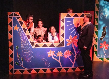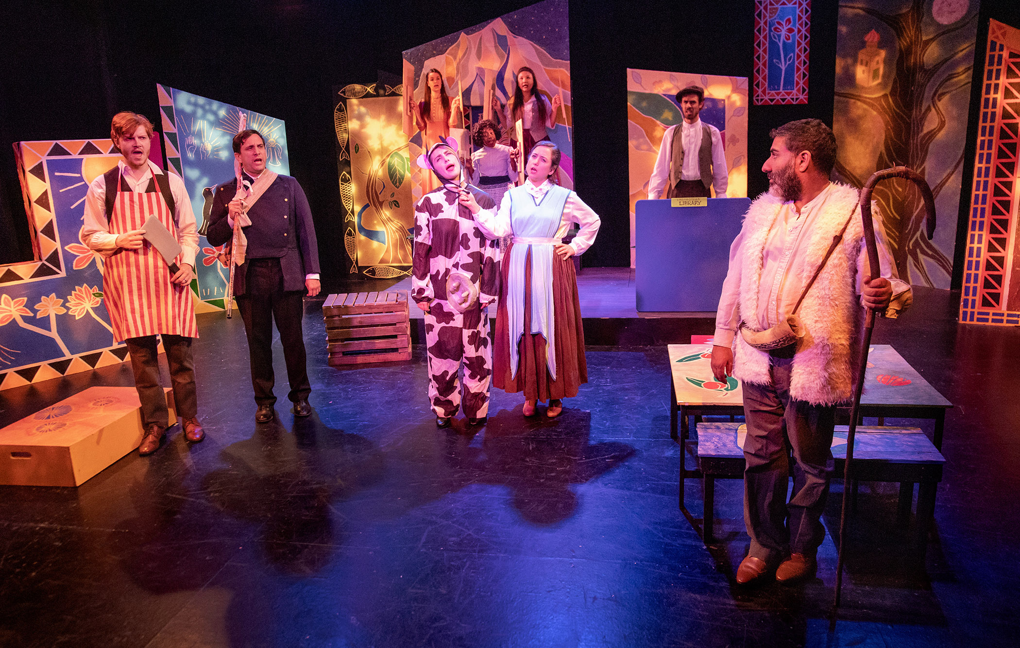 Brendan Mulally (Far Left) as “Slovich, The Butcher”, Hank Jacobs (Left) as “Mishkin, The Postman”, Nina Genatossio (Center Left) as “The Cow”, and Cat Davis (Center Right) as “Yenchna, The Fish Peddler” ask Parvesh Cheena (Downstage Right) as “Snetsky, The Shepherd” for “Any News” regarding the new teacher’s big ‘test’ in the “Open Fist Theatre Company’s” 2019 Premiere Production Of Neil Simon’s “Musical Fools”