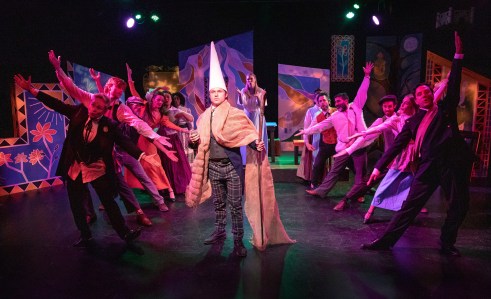If you’re in the market for a good, old fashioned. “Forget your troubles” kind of musical you’ve hit the jackpot here—so what if it all adds up to lunacy, it’s lovable lunacy! Upon entering, you find that even the pre-curtain music blasted over the auditorium speakers features a selection of Top 40 tunes that all have something to do with “Fool” in the title–such as Aretha Franklin’s “Chain Of Fools”, “Everybody Plays The Fool” by the 70’s pop group, “The Main Ingredient” or even Barbra Streisand’s “What Kind Of Fool”. Writer/Director Ron West and Composer Phil Swann have something of a fortuitous history with the theater—having previously co-authored the musicals “deLEARious” (for which West directed both the 2008 premiere and the 2017 revival,) and “The People Vs. Friar Lawrence” (based on a key character from Shakespeare’s “Romeo And Juliet”.) Perhaps because they’ve infused so much of Simon’s authentic words into them, the lyrics sincerely capture the essence of the “American Theater Hall Of Famer” and “Kennedy Center Honoree” at his quintessential best. Indeed, some of the cleverest lines categorically sneak up on you, while the songs spring logically from the dialogue or situations–and in prime “Melodramatic” style, there’s even a few twists-and-turns on the road the big “Happy Ending” (especially in the second act!) On occasion, Director West also cunningly utilizes cut-outs to delineate supposedly ‘larger’, more ‘cinematic’ movements; but superlative material isn’t the only thing this premiere production can boast—add to it, the strong, enthusiastic cast fueled by the ensemble who themselves have a few delightful turns in the spotlight working primarily as a group. Take for example how over the course of the events we’re witnessing, it becomes obvious (to us anyway) that “Mishkin” the town postman (who, we’re appraised, has never successfully delivered a letter to the correct addressee,) yearns for the “Yenchna” the local Fishwife , motivating him to seek advice from the Magistrate, “Slovich” the Butcher, and “Snetsky” the Shepherd (—the truth is that Mishkin is head-over-heels in love but he’s too out-of-it to realize this!) Either way, it’s a fine excuse for a first-rate quartet which is breezy, fun and fast moving—exhibiting some superb harmony from all those involved. Chalk this up as a definite highpoint of the first half. Their next group endeavor (–there are several,) involves the four in addition to “Yenchna” herself and her cow (or a person dressed-up as her cow,) that is itself bouncy and loaded with tongue-twisting puns—along with more smart choreography to boot: “We face confusion every day; if brains were trains, we’d have slow ones…” they collectively pine. (Think of it as a Russian-esque “Rap Song” as they re-state the premise in a nimble, semi hip-hop manner.) Before the close of Act One, the community “Prayer” from the townspeople is again full of refreshing harmony as a disheartened “Leon” laments his feared potential fate: “If you remember nothing else, remember I loved you so…” he moans to “Sophia”.