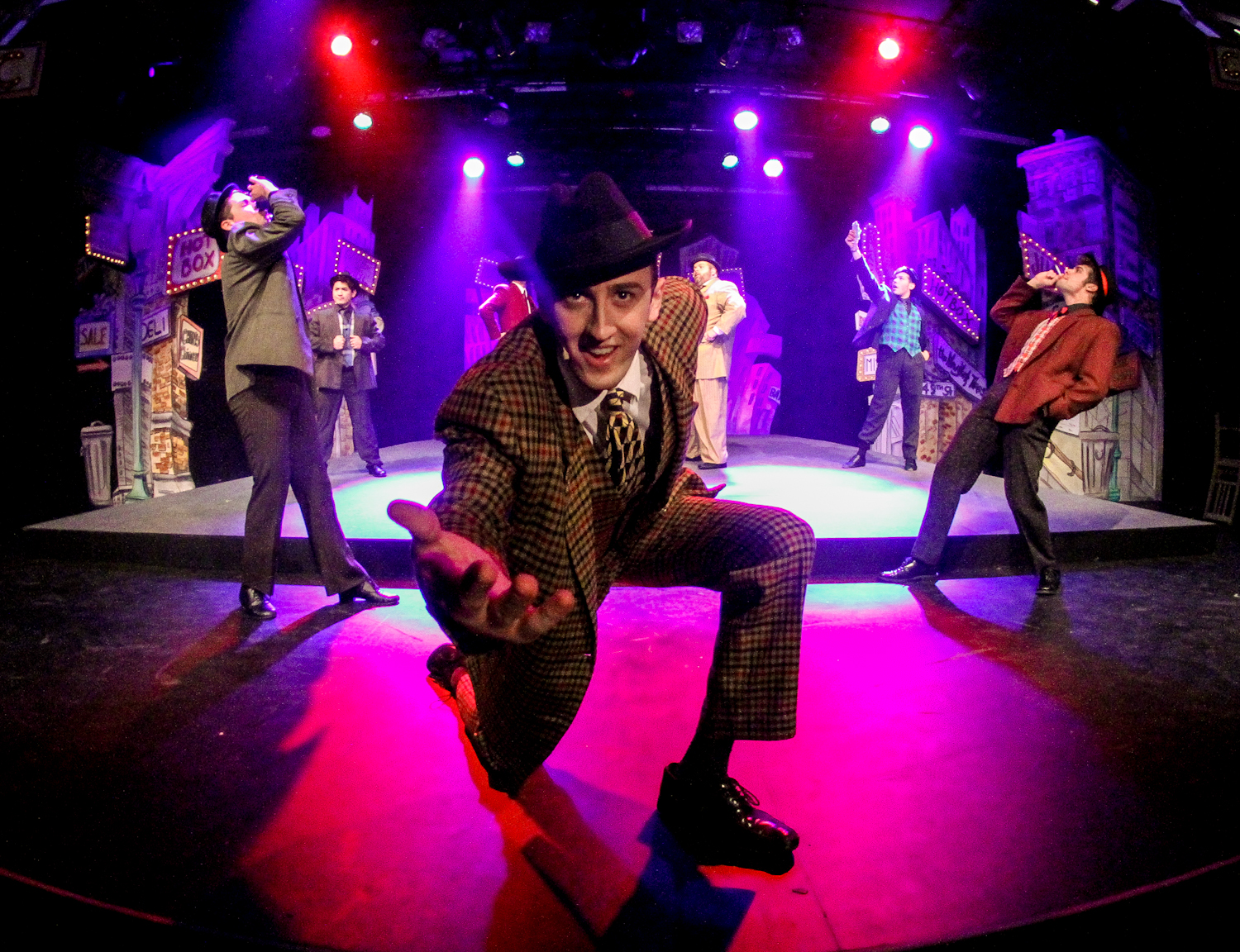 “When you see a ‘Joe’ saving half of his dough, you can bet there’ll be mink in it for some doll! When a bum buys wine like a bum can’t afford, it’s a cinch that the bum is under the thumb of some little broad! When you meet a mug lately out of the jug, and he’s still lifting ‘platinum folderol’: Call it Hell, call it Heaven, but it’s probable twelve-to-seven that the Guy’s only doing it for some Doll!” Bryan Fraser as “Harry The Horse” joins other denizens of old Broadway in welcoming you to “Runyonland” in One More Productions’ 2020 Staging of “Guys And Dolls”