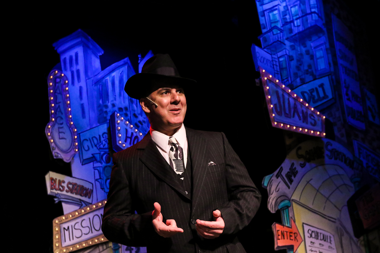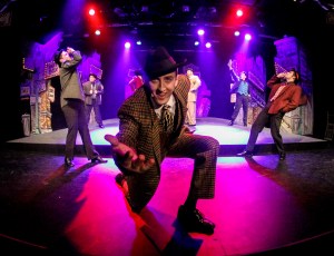 “Either of you guys seen Nathan Detroit? I mean the ‘Nathan Detroit’ who’s been running a floating crapgame around here! You can tell him for me: I know that right now he’s running around trying to find a spot…” Johnnie Gillies as that ‘Lousy Lt. Brannigan” of the NYPD keeps his nose to the grindstone sniffing around to catch a certain illegal dice game (and the guy who runs it) in One More Productions’ 2020 Staging of “Guys And Dolls”
