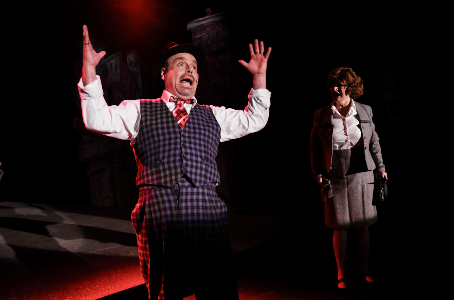 “Alright Already! So call a Policeman! Alright, already, it’s true (…so new?) So sue me, sue me–what can you do me?! I LOVE YOU!” Damien Lorton as “Nathan Detroit” has to at last ‘come clean’ to Adriana Sanchez as his “Fiancée” of fourteen year running, in One More Productions’ 2020 Staging of “Guys And Dolls”