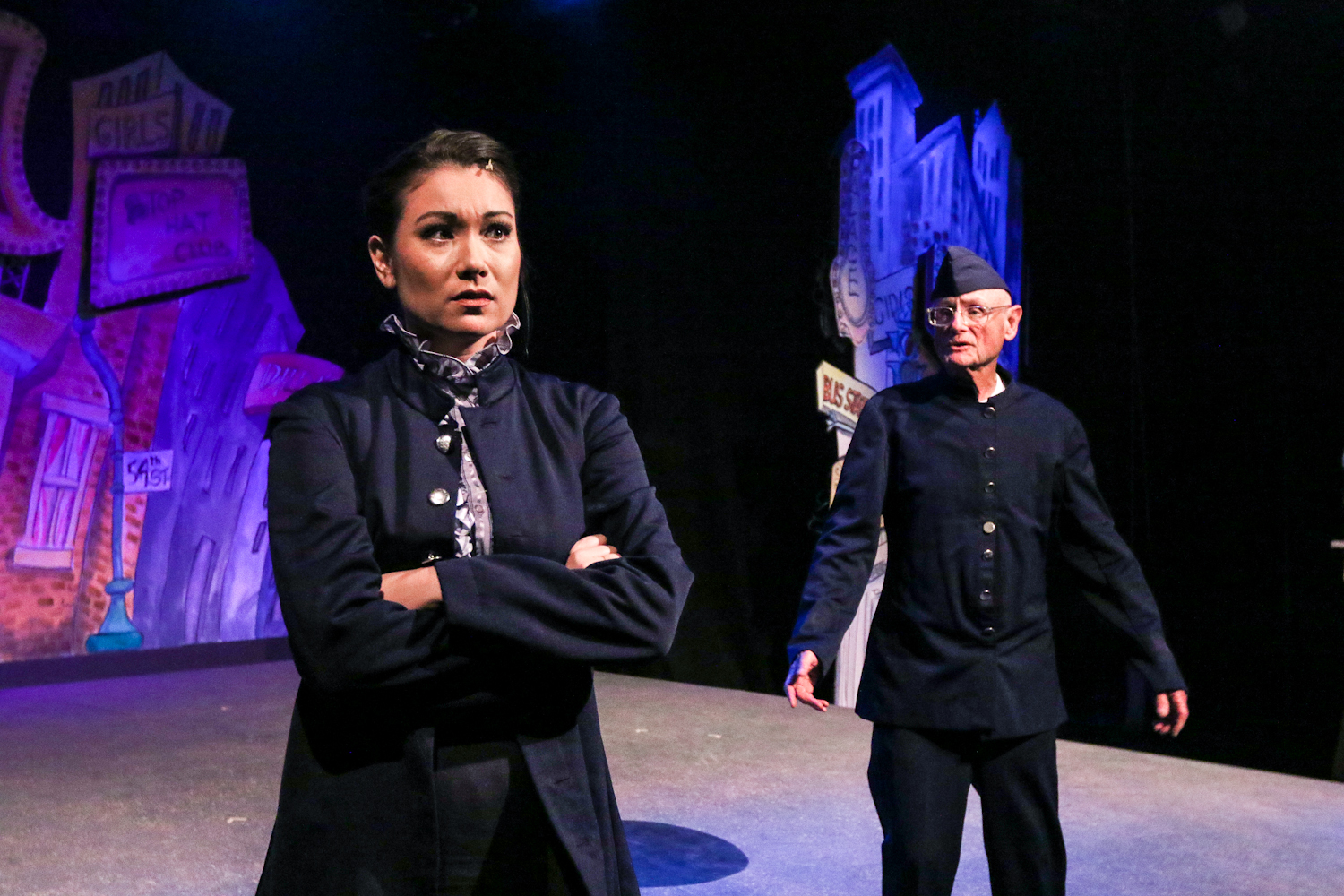 Re-teaming with him is Erika Baldwin, who also beguiles as his unlikely “Lady Love”, “Sarah Brown”. (Many among “The Gem’s” audience regulars are bound to recall their equally laudable work together from OMP’s 2017 production of “The Music Man” and they’re as compelling—or better—to watch together here!)