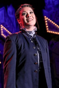 Clad in a loud checkered suit and a (non-matching) wide-brimmed fedora with a cherry-red headband, Damien Lorton is brilliant as “Good Ol’ Reliable’ “Nathan Detroit”! As a performer, Lorton has a way with the libretto’s abundance of slick ‘throwaway’ lines, and he has an awesome singing voice too! If anything, it’s something of a shame that he doesn’t have more opportunities to show-off exactly how incredible it is, but as written back in 1950, “Mr. Detroit” wasn’t afforded much in the way of ballads or solo stanzas. (When Frank Sinatra was cast for the 1955 big-screen adaptation, several new songs were inserted just for him, and one can’t help but think it would have been enjoyable to hear Lorton’s trying them out here.) Still, when he can vocalize, as in “The Oldest, Established…” it’s always exhilarating. What he does have is an amazing lead character to flesh-out (“Nathan” is, after all, at the core of all the undertakings) and in this regard he never disappoints! At the same time, played with a surfeit of good ol’ fashioned ‘panache’, Johnny Fletcher also excels as “Sky (real name “Obadiah”) Masterson”! One of his most eloquent accomplishments involved with this role perhaps, is how he so adeptly maintains the generally brisk pace of the goings-on, while still coming off so smooth and suave (Yes, his “Sky” is a streetwise fast-talker but he’s a dashing one at that!) Recalling a young Perry Como or Tony Bennet, Fletcher’s song-styling is also relaxed and insightful, which ironically gives his numbers an increased vitality. “My Time Of Day” (the prelude to the celebrated” “I’ve Never Been In Love Before”) is a categorical victory for him and, transpiring late in the first act, is a sincere high point–both for him and the whole first half. As for the number it leads into, let’s just put it thusly: there couldn’t be a better way to bring the Act to a successful—and riveting—close! Of course, many will tell you that the most recognizable of all the songs “Sky” is given bar none, is the spectacular “Luck Be A Lady Tonight” and, you can bet Mr. Fletcher absolutely pulls out all the stops for it! Backed by the male ensemble, (who furnish some rousing counter obbligato) the momentum steadily builds up to Masterson’s fateful roll of the dice, bursting into a phenomenal climax that itself is thoroughly worth the wait as well (in a phrase: musical theater moments don’t come any finer than this!)