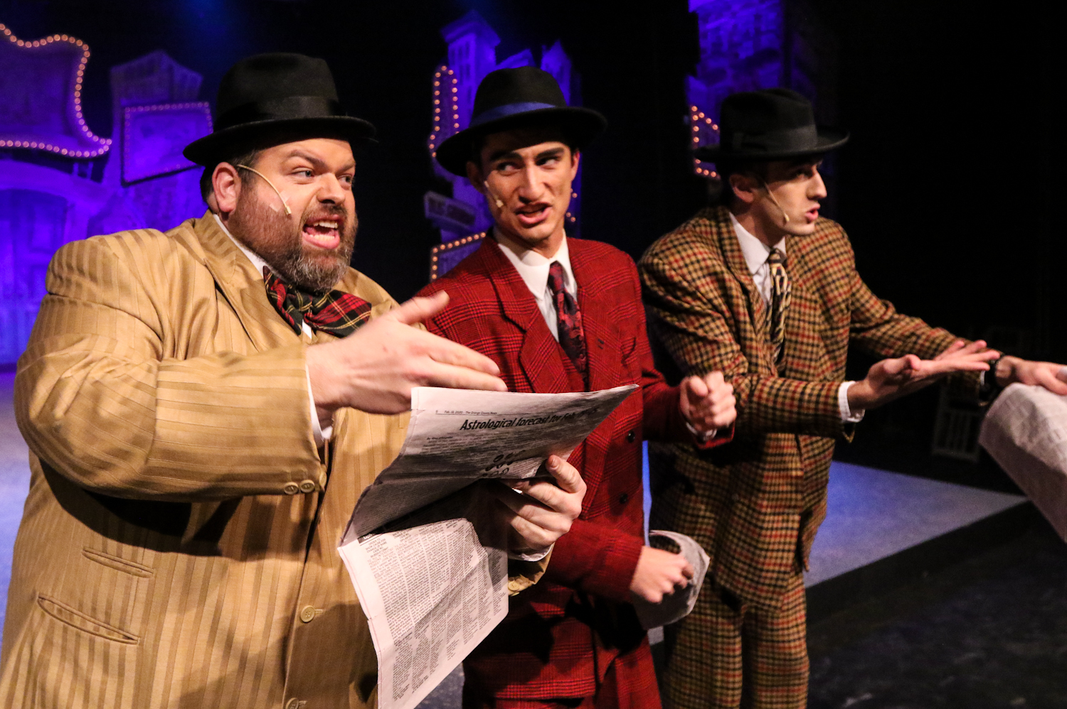 “I’m pickin’ ‘Valentine’–‘cause on the ‘Morning Line’, the guy has got him figured at five-to-nine; I know it’s ‘Valentine’–the morning works look fine (besides the jockey’s brother’s a friend of mine!)” Ryan Addison (Left) as “Nicely-Nicely Johnson”, Braden Martino (Center) as “Benny Southstreet” and Bryan Fraser (Right) as “Harry The Horse” are all sure they “Got The Horse Right Here” at the start of One More Productions’ 2020 Staging of “Guys And Dolls”